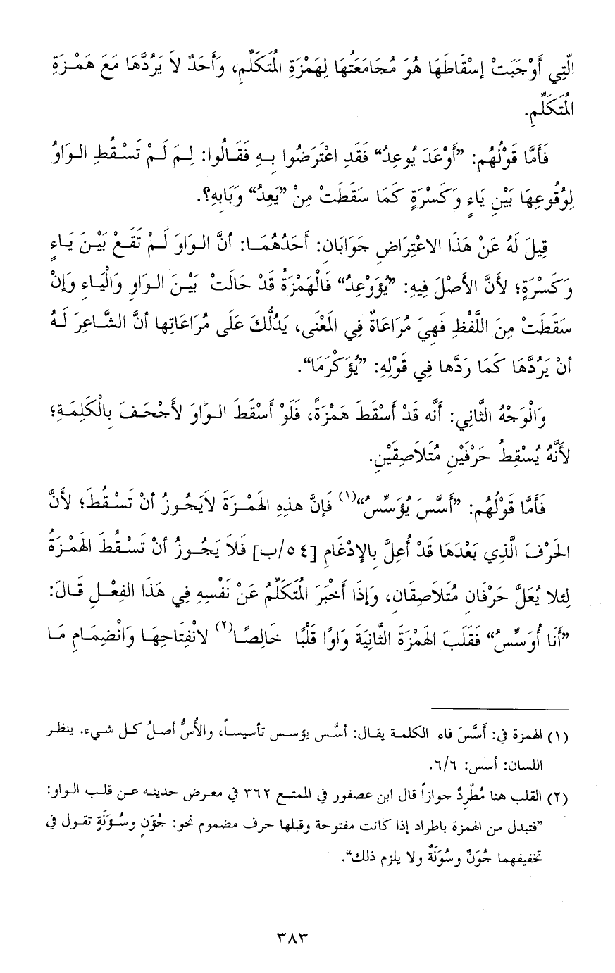 فأمّا قولهم: "أسّس يُؤسِّسُ" فإنّ هذه الهمزة لا يجوز أن تسقط، لأنّ الحرف الذي بعدها قد أعلَّ بالإدغام فلا يجوز أن تسقط الهمزة لئلا يُعَلَّ حرفان متلاصقان، وإذا أخبر المتكلّم عن نفسه في هذا الفعل قال: "أنا أُؤَسِّسُ" فقلب الهمزة الثانية واوًا قلبًا خالصًا لانفتاحها وانضمام ما