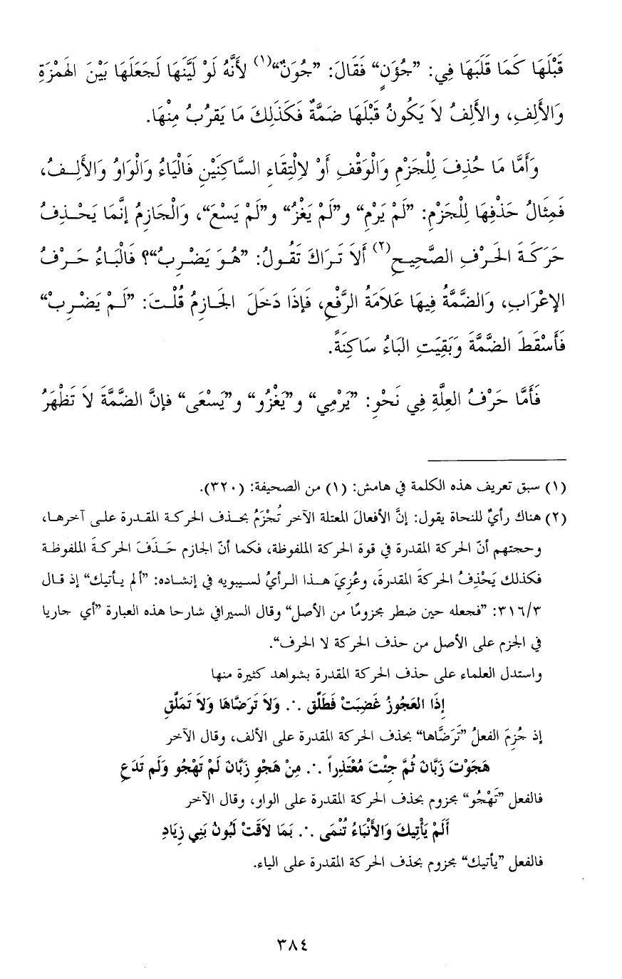 وأمّا ما حذف للجزم والوقف أو لالتقاء السّاكنين فالياء والواو والألف، فمثال حذفها للجزم: "لم يَرْمِ" و"لم يَغْزُ" و"لم يَسْعَ"، والجازم إنّما يحذف حركة الحرف الصّحيح ألا تراك تقول: "هو يضرب"؟ فالباء حرف الإعراب، والضّمّة فيها علامة الرّفع، فإذا دخل الجازم قلت: "لم يضربْ" فأسقط الضّمّة وبقيت الباء ساكنة.