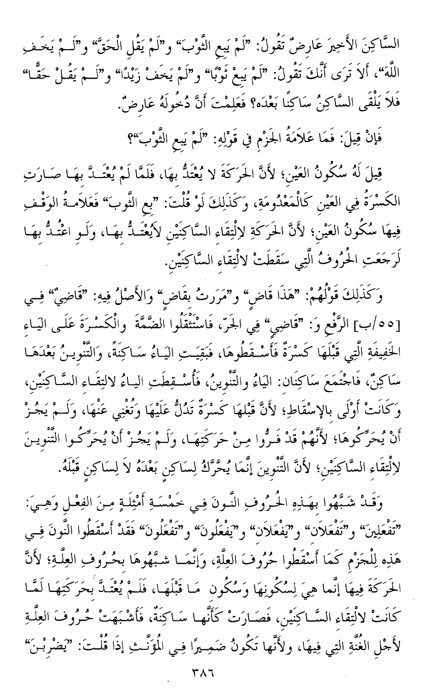 السّاكن الأخير عارِضٌ تقول: "لم يبع الثّوبَ" و"لم يقل الحقَّ" و"لم يخف اللهَ"، ألا ترى أنّك تقول: "لم يبع ثوبًا" و"لم يخف زيدًا" و"لم يقل حقًّا" فلا يلقى السّاكن ساكنًا بعده؟ فعلمت أنّ دخوله عارضٌ.