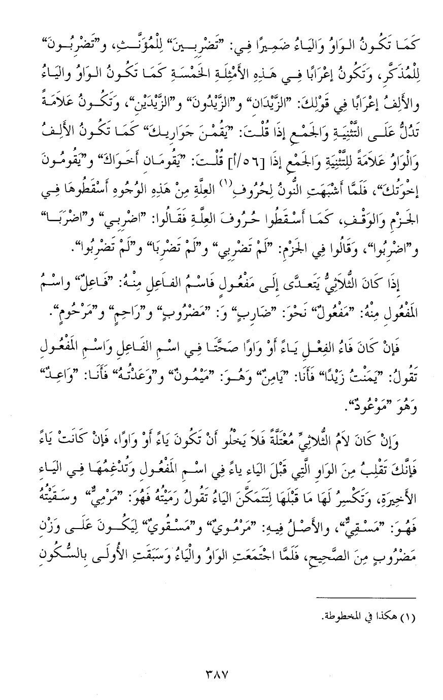 كما تكون الواو والياء ضميرًا في "تضربينَ" للمؤنث، و"تضربون" للمذكر، وتكون إعرابًا في هذه الأمثلة الخمسة كما تكون الواو والياء والألف إعرابًا في قولك: "الزّيدان" و"الزّيدون" و"الزَّيْدَيْنِ"، وتكون علامة تدلّ على التّثنية والجمع إذا قلت: "يَقْمْنَ جواريك" كما تكون الألف والواو علامة للتثنية والجمع إذا قلت: "يقومان أخواك" و"يقومون إخوتك"، فلمّا أشبهت النّون لحروف العلّة من هذه الوجوه أسقطوها في الجزم والوقف، كما أسقطوا حروف العلّة فقالوا: "اضربي" و"اضربا" و"اضربوا"، وقالوا في الجزم: "لم تضربي" و"لم تضربا" و"لم تضربوا".
