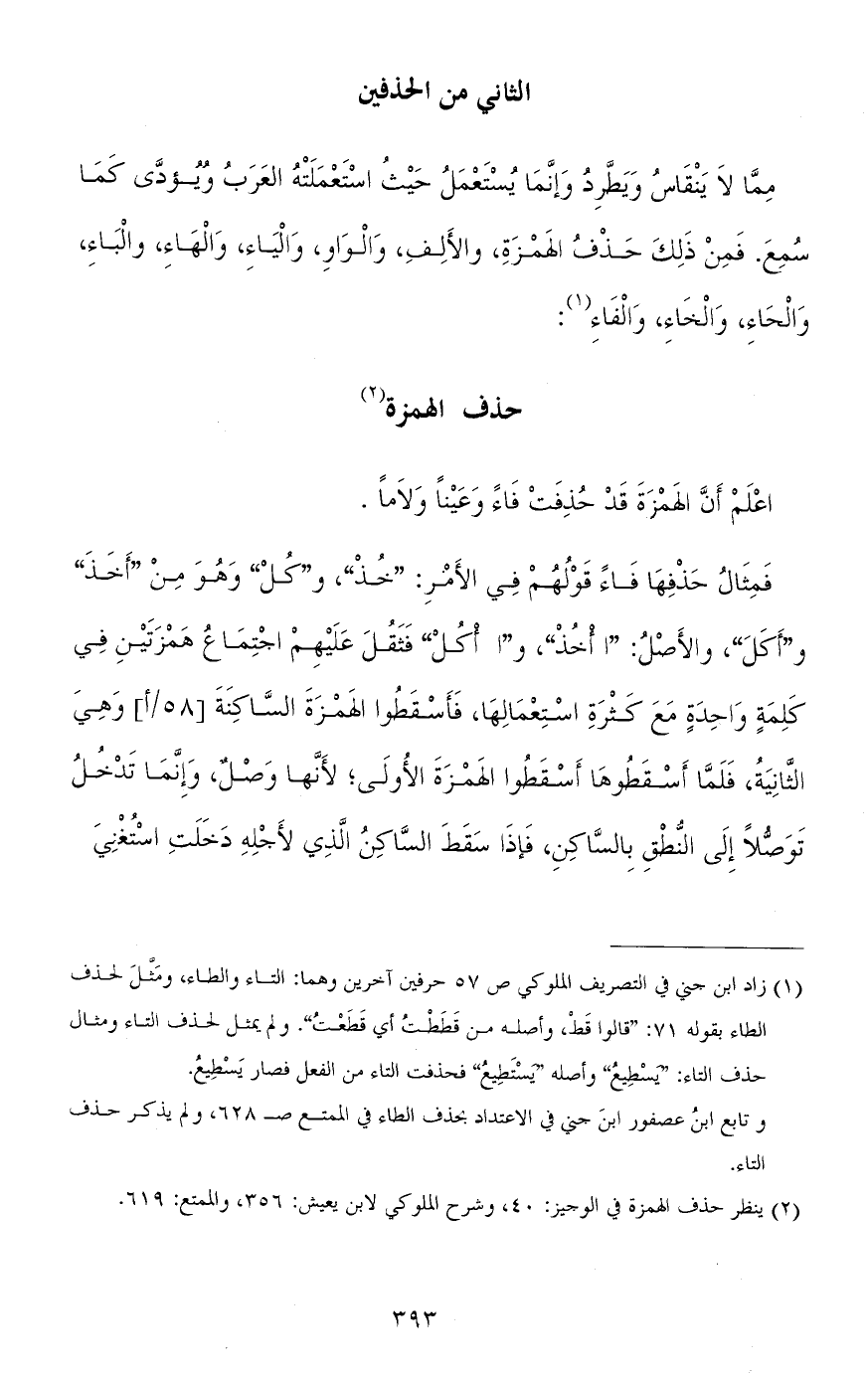ممّا لا ينقاس ولا يطّرد وإنّما يستعمل حيث استعملته العرب ويؤدَّى كما سمع. فمن ذلك حذف الهمزة، والألف، والواو، والياء، والهاء، والباء، والحاء، والخاء، والفاء: