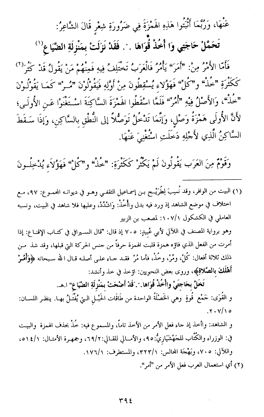 فأمّا الأمر من: "أَمَرَ" يامُرُ فالعرب تختلف فيه فمنهم من يقول قد كَثُرَ ككثرة "خُذْ" و"كُلْ" فهؤلاء يسقطون من أوّله فيقولون "مُرْ" كما يقولون "خُذْ"، والأصل فيه "امُرْ" فلمّا أسقطوا الهمزة السّاكنة استغنوا عن الأولى، لأنّ الأولى همزة وصل، وإنّما تدخل توصُّلاً إلى النّطق بالسّاكن، وإذا سقط السّاكن الذي لأجله دخلت استغني عنها.