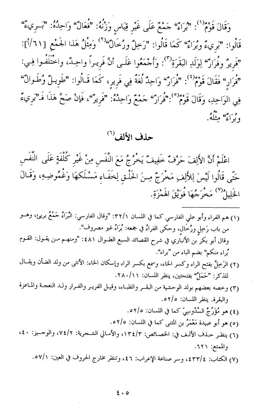 وقال قوم: "بُراءٌ" جمع على غير قياس وزنه: "فُعالٌ" واحده: "بريءٌ" قالوا: "بريءٌ وبُراءٌ" كما قالوا: "رَخِلٌ ورُخالٌ" ومثل هذا الجمع: "فَريرٌ وفُرارٌ" لولد البقرة: وأجمعوا على أنّ فريرًا واحد، واختلفوا في: "فُرارٍ" فقال قوم: "فُرارٌ" واحد لغة في فَرير، كما قالوا: "طَويلٌ وطُوالٌ" في الواحد، وقال قوم: "فُرارٌ" جمع واحده: "فَريرٌ"، فإن صحَّ هذا فـ"بريءٌ وبُراءٌ" مثله.