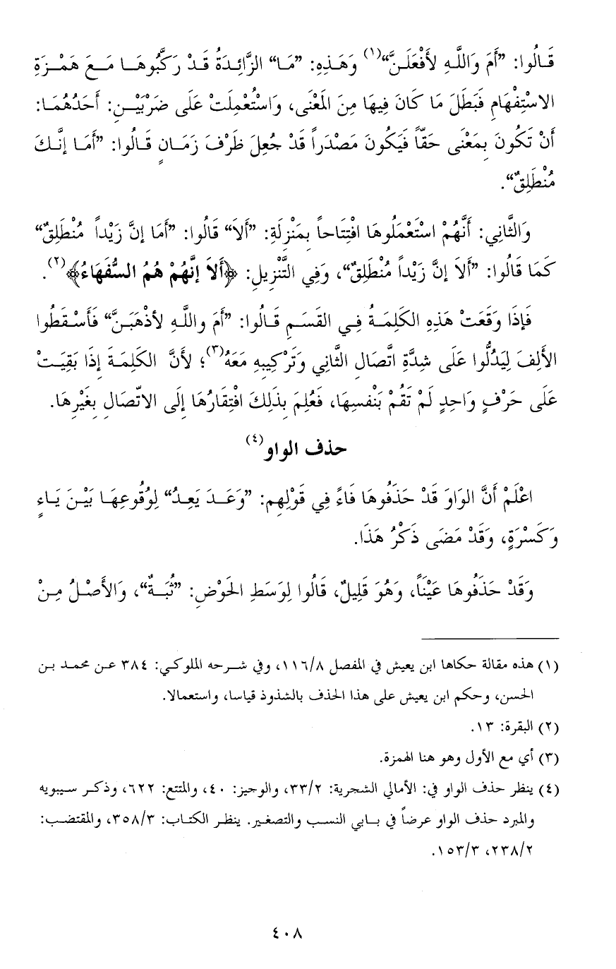 فإذا وقعت هذه الكلمة في القَسَم قالوا: "أمَ واللهِ لأذهبنَّ" فأسقطوا الألف ليدلّوا على شدّة اتّصال الثّاني وتركيبه معه، لأنّ الكلمة إذا بقيت على حرف واحد لم تقم بنفسها، فعُلِم بذلك افتقارها إلى الاتّصال بغيرها.