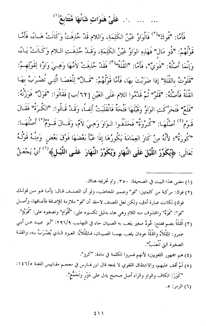 فأمّا: "فُوكَ" فالواو عين الكلمة، واللام قد حذفت وكانت هاء، فأمّا قولهم: "ذو مالٍ" فهذه الواو عين الكلمة، وقد حذفت اللام وكانت ياءً، وإنّما أصله: "ذَوَيٌ"، فأمّا: "القُلَةُ" فقد حذفت لامها وهي واوٌ، لقولهم: "قَلَوْتُ بالقُلَة" إذا ضربت بها، فأمّا قولهم: "قالٌ" للعصا التي تضرب بها القُلَةُ فأصله: "قَلَوٌ" ثمّ قدّموا اللام على العين فقالوا: "قَوَلٌ" فوزنه: "فَلَعٌ" فتحرّكت الواو وقبلها فتحة فانقلبت ألفًا، وقد قالوا: "الكرةُ" فقال قومٌ أصلها: "كُرْوَةٌ" فحذفوا الواو وهي لامٌ، وقال قومٌ أصلها: "كُورَةٌ"؛ لأنّه من كارَ العمامة يَكُورُها إذا عبَّأ بعضها فوق بعض ومنه قوله تعالى: (يُكَوِّرُ الليلَ على النّهار ويكوِّرُ النّهار على اللّيل) أي يجعل