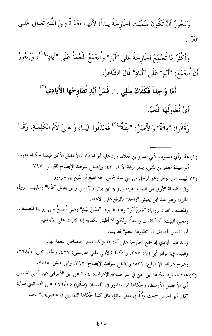 وقالوا: "مائةٌ" والأصل: "مِئْيَةٌ" فحذفوا الياء وهي لام الكلمة. وقد