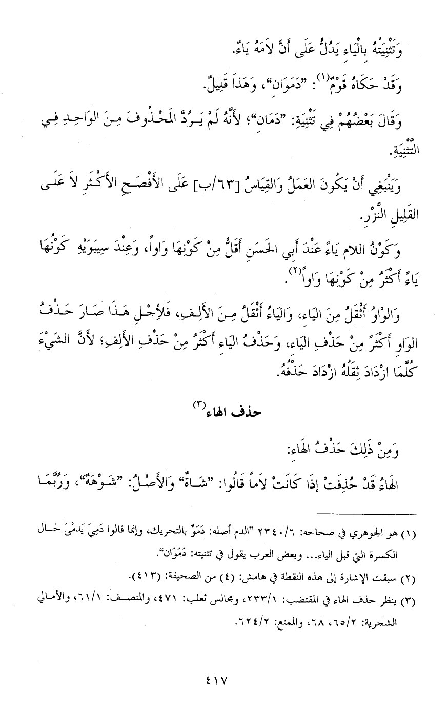 الهاء قد حذفت إذا كانت لامًا قالوا: "شاةٌ" والأصل: "شَوْهَةٌ"، وربّما