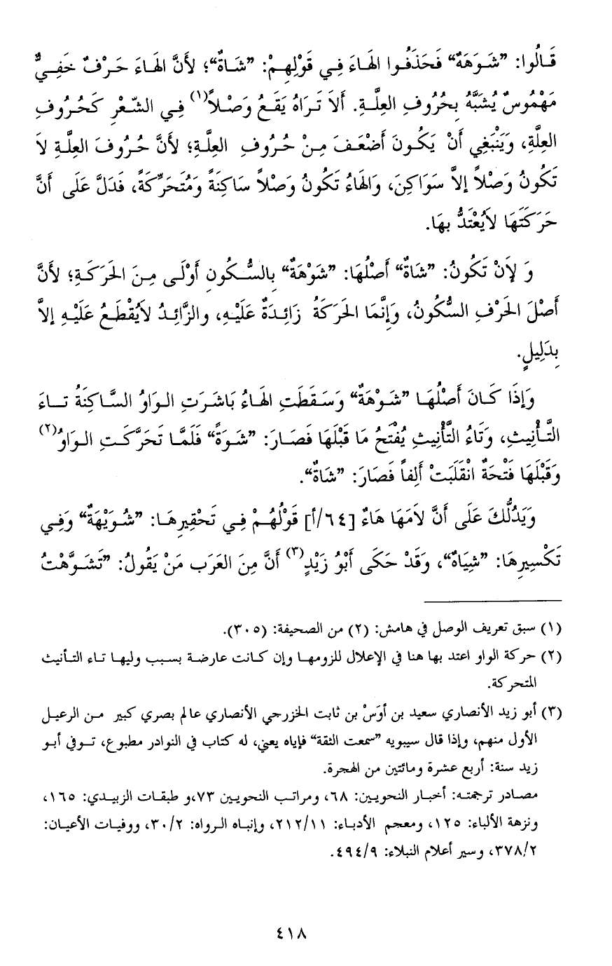قالوا: "شَوَهَةٌ" فحذفوا الهاء في قولهم: "شاةٌ"، لأنّ الهاء حرف خَفيٌّ مهموس يُشَبَّه بحروف العلّة. ألا تراه يقع وصلاً في الشّعر كحروف العلّة، وينبغي أن يكون أضعف من حروف العلّة؛ لأنّ حروف العلّة لا تكون وصْلاً إلاّ سواكن، والهاء تكون وصلا ساكنة ومتحركة، فدلَّ على أنّ حركتها لا يُعْتَدُّ بها.