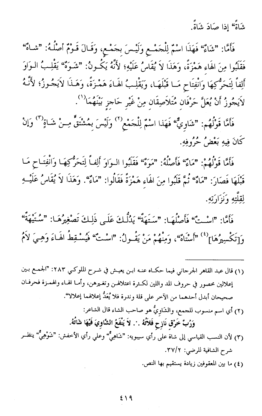 فأمّا: "شاءٌ" فهذا اسم للجمع وليس بجمع، وقال قوم أصله: "شاهٌ" فقلبوا من الهاء همزة، وهذا لا يقاس عليه، لأنّه يكون "شَوَهٌ" يقلب الواو ألفًا لتحرّكها وانفتاح ما قبلها، ويقلب الهاء همزة، وهذا لا يجوز؛ لأنّه لا يجوز أن يُعَلَّ حرفان متلاصقان من غير حاجز بينهما.