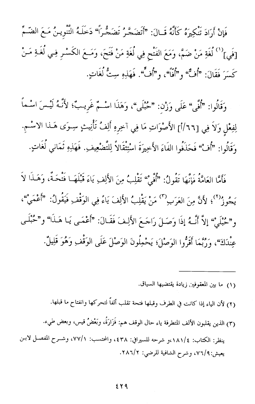 فأمّا العامّة فإنّها تقول: "أُفَّيْ" تقلب من الألف ياء قبلها فتحة، وهذا لا يجوز، لأنّ من العرب من يقلب الألف ياء في الوقف فيقول: "أعْمَيْ" و"حُبْلَيْ" إلاّ أنّه إذا وصل مع الألف فقال: "أعمى يا هذا" و"حُبلى عندك"، وربّما أقرّوا الوصل؛ يحملون الوصل على الوقف وهو قليلٌ.