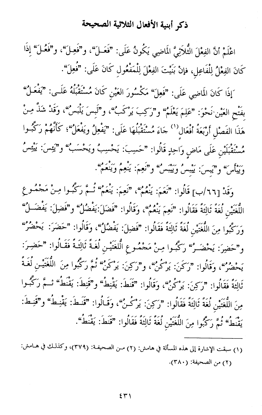 وقد قالوا: "نَعَمَ: ينعُمُ"، "نعِمَ: ينْعَمُ" ثمّ ركّبوا من مجموع اللغتين لغة ثالثة فقالوا: "نعِمَ ينعُمُ"، وقالوا: "فَضَلَ: يفْضُلُ" و"فَضِلَ: يفضَلُ" وركّبوا من اللغتين لغة ثالثة فقالوا: "فَضِلَ: يفضُلُ"، وقالوا: "حَضَرَ: يحضُرُ" و"حضِرَ: يحضَرُ" ركّبوا من مجموع اللغتين لغة ثالثة فقالوا: "حضِرَ: يحضُرُ"، وقالوا: "رَكَنَ: يركُنُ" و"رَكِنَ يركَنُ" ثمّ ركبوا من اللغتين لغة ثالثة فقالوا: "رَكِنَ يركُنُ"، وقالوا: "قَنَطَ: يقنِطُ" و"قنِطَ يقنَطُ" ثمّ ركّبوا من اللغتين لغة ثالثة فقالوا: "ركِنَ: يركُنُ"، وقالوا: "قنَطَ يقنِطُ" و"قنِطَ يقنَطُ" ثمّ ركّبوا من اللغتين لغة ثالثة فقالوا: "قنَطَ: يقنْطُ".