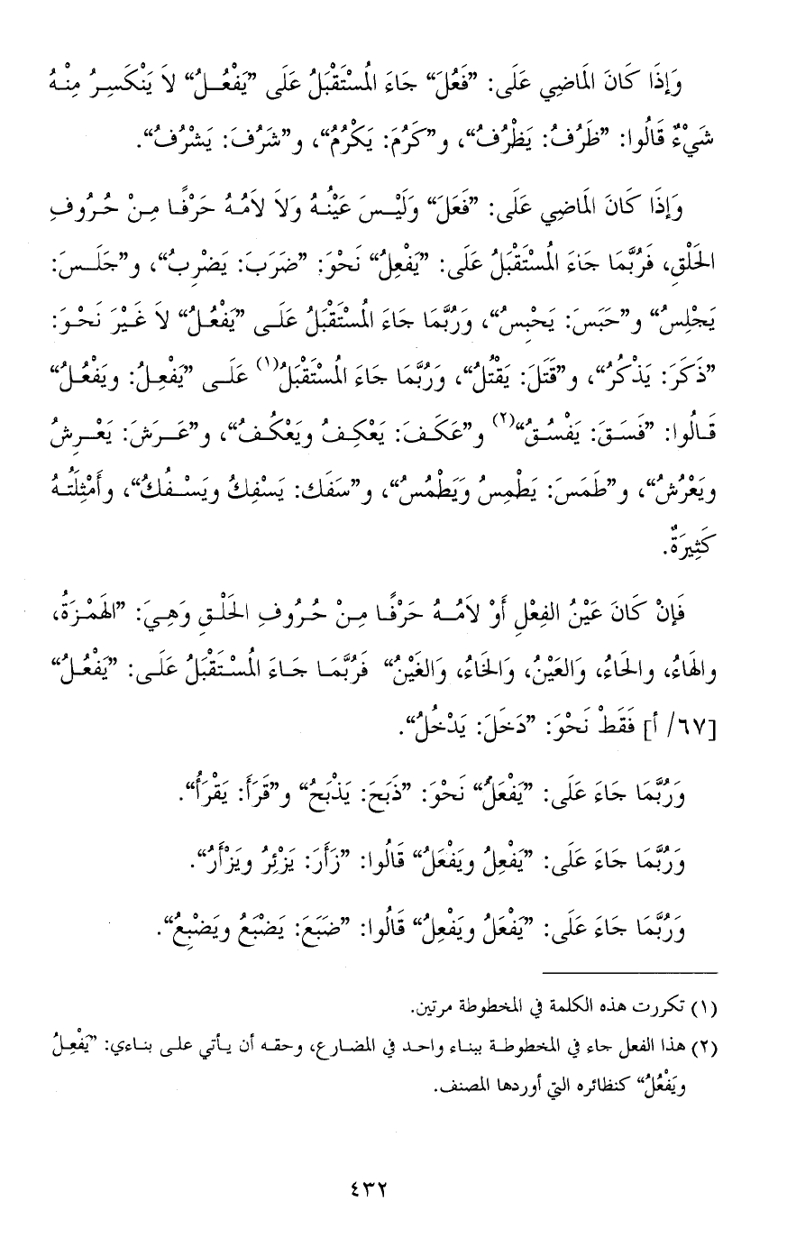 وإذا كان الماضي على "فَعَلَ" وليس عينه ولا لامه حرفًا من حروف الحلق، فربّما جاء المستقبل على: "يفعِلُ" نحو: "ضرَبَ يضرِبُ" و"جلَسَ يجلِسُ" و"حبسَ يحبِسُ"، وربّما جاء المستقبل على "يفعُلُ" لا غير نحو: "ذكرَ يذْكُرُ" و"قتلَ يقتُلُ"، وربّما جاء المستقبل على "يفعِلُ ويفعُلُ" قالوا: "فسَقَ يفسُقُ" و"عَكَفَ: يعكِفُ ويعكُفُ"، و"عرَشَ: يعرِشُ ويعرُشُ"، و"طَمَسَ: يطْمِسُ ويطمُسُ"، و"سفَكَ: يسفِكُ ويسفُكُ"، وأمثلته كثيرة.