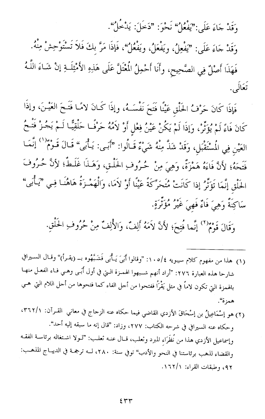 فإذا كان حرف الحلق عينًا فتح نفسه، وإذا كان لامًا فتح العين، وإذا كان فاء لم يؤثّر، وإذا لم يكن عين فعل أو لامه حرفًا حلقيًّا لم يجز فتح العين في المستقبل، وقد شذّ منه شيء قالوا: "أبى: يأبَى" قال قوم إنّما فتحه، لأنّ فاءه همزة وهي من حروف الحلق، وهذا غلط، لأنّ حروف الحلق إنّما تؤثّر إذا كانت متحرّكة عينًا أو لامًا، والهمز هاهنا في "يابَى" ساكنة وهي فاء فهي غير مؤثّرة.
