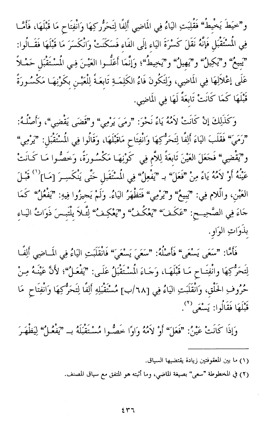 وكذلك إن كانت لامه ياء نحو: "رمَى يرْمِي" و"قَضَى يقْضِي"، وأصله: "رَمَيَ" فقلب الياء ألفًا لتحرّكها وانفتاح ما قبلها، وقالوا في المستقبل: "يرْمِي" و"يقْضِي" فجعل العين تابعة للاّم في كونها مكسورة، وخصّوا ما كانت عينه أو لامه ياء من "فَعَلَ" بـ"يفْعِلُ" في المستقبل حتّى ينكسر [ما] قبل العين واللام في: "يبِيعُ" و"يرمِي" فتظهر الياء. ولم يجيزوا فيه: "يفعُلُ" كما جاء في الصّحيح: "عَكَفَ" "يعْكُفُ" و"يعكِفُ" لئلاّ يلتبس ذوات الياء بذوات الواو.