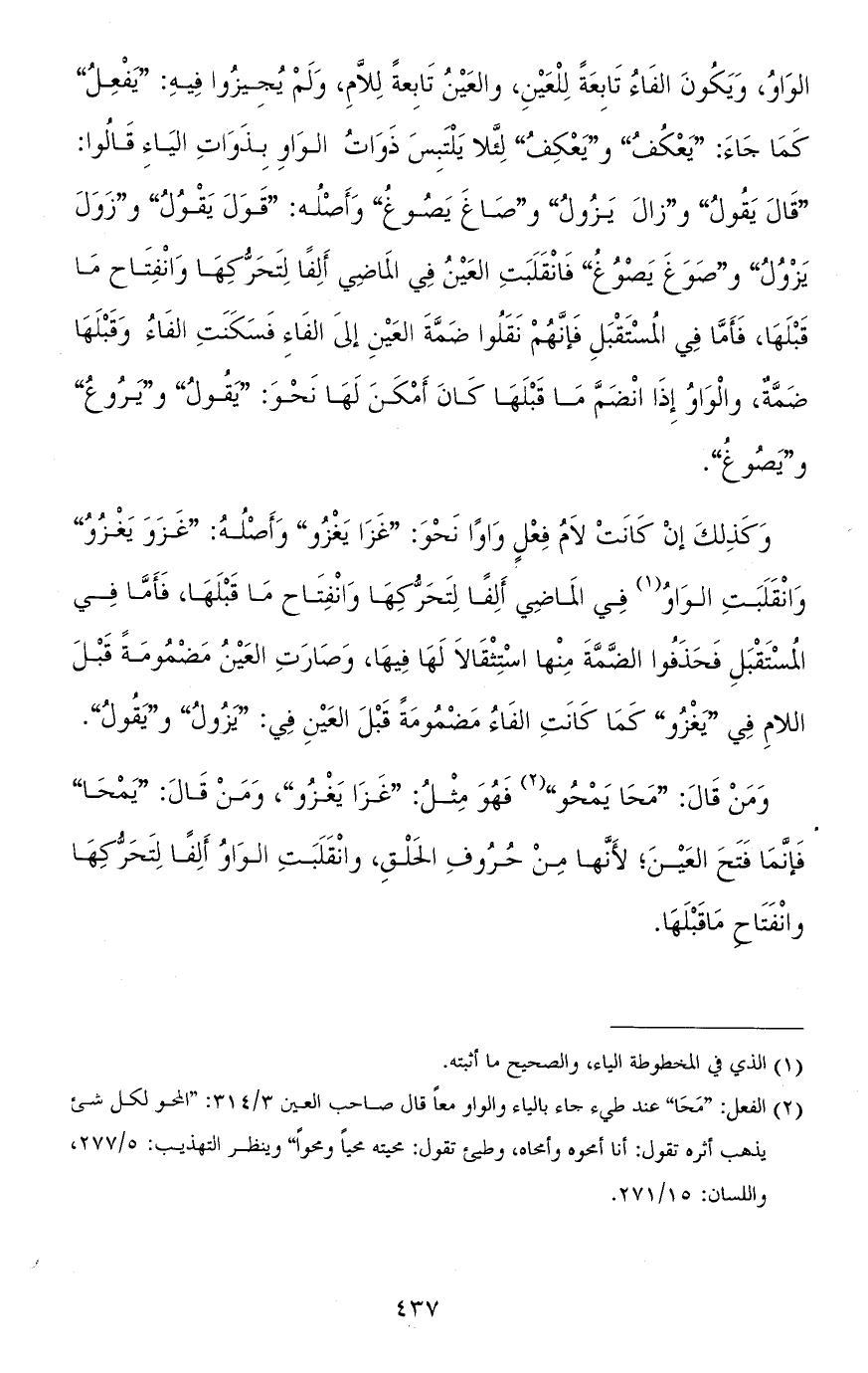 الواو، ويكون الفاء تابعة للعين، والعين تابعة للّام، ولم يجيزوا فيه: "يفْعِلُ" كما جاء "يعْكُفُ" و"يعكِفُ" لئلاّ يلتبس ذوات الواو بذوات الياء قالوا: "قالَ يقُولُ" و"زال يزُولُ" و"صاغَ يصُوغُ" وأصله: "قَوَلَ يقْوُلُ" و"زَوَلَ يزْوُلُ" و"صَوَغَ يصْوُغُ" فانقلبت العين في الماضي ألفًا لتحرّكها وانفتاح ما قبلها، فأمّا في المستقبل فإنّهم نقلوا ضمّة العين إلى الفاء فسكنت الفاء وقبلها ضمّة، والواو إذا انضمّ ما قبلها كان أمكن لها نحو: "يقُولُ" و"يرُوعُ" و"يصُوغُ".
