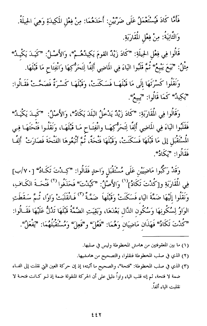 وقالوا في المقاربة: "كاد زيدٌ يدخُلُ البلدَ يكادُ"، والأصل: "كَيِدَ يكْيَدُ" فقلبوا الياء في الماضي ألفًا لتحرّكها وانفتاح ما قبلها، ونقلوا فتحتها في المستقبل إلى ما قبلها فسكنت، وقبلها فتحة، ثمّ أتبعوها الفتحة فصارت ألفًا فقالوا: "يكادُ".