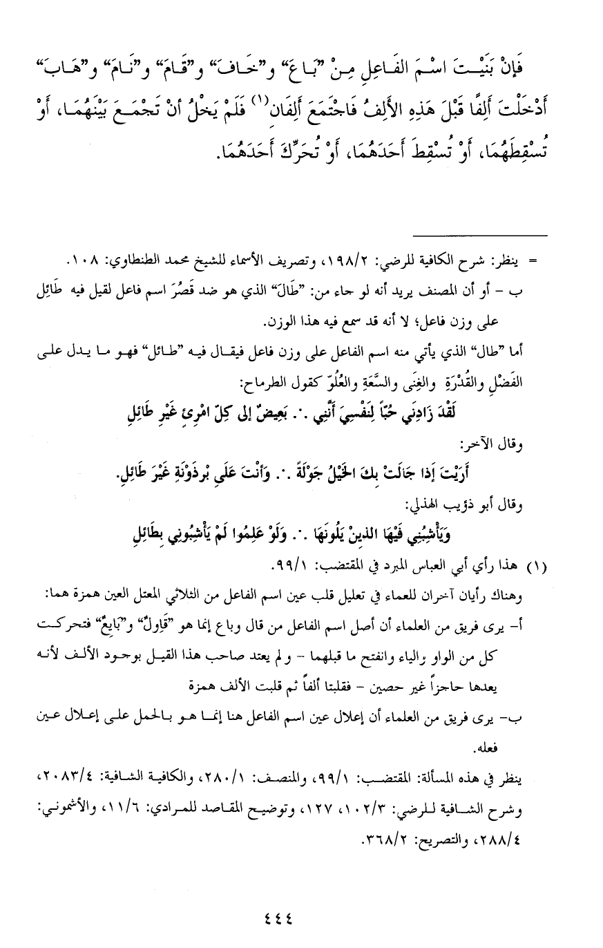 فإن بنيت اسم الفاعل من "باعَ" و"خاف" و"قام" و"نام" و"هاب" أدخلت ألفًا قبل هذه الألف فاجتمع ألفان فلم يخل أن تجمع بينهما، أو تسقطهما، أو تسقط أحدهما، أو تحرّك أحدهما.