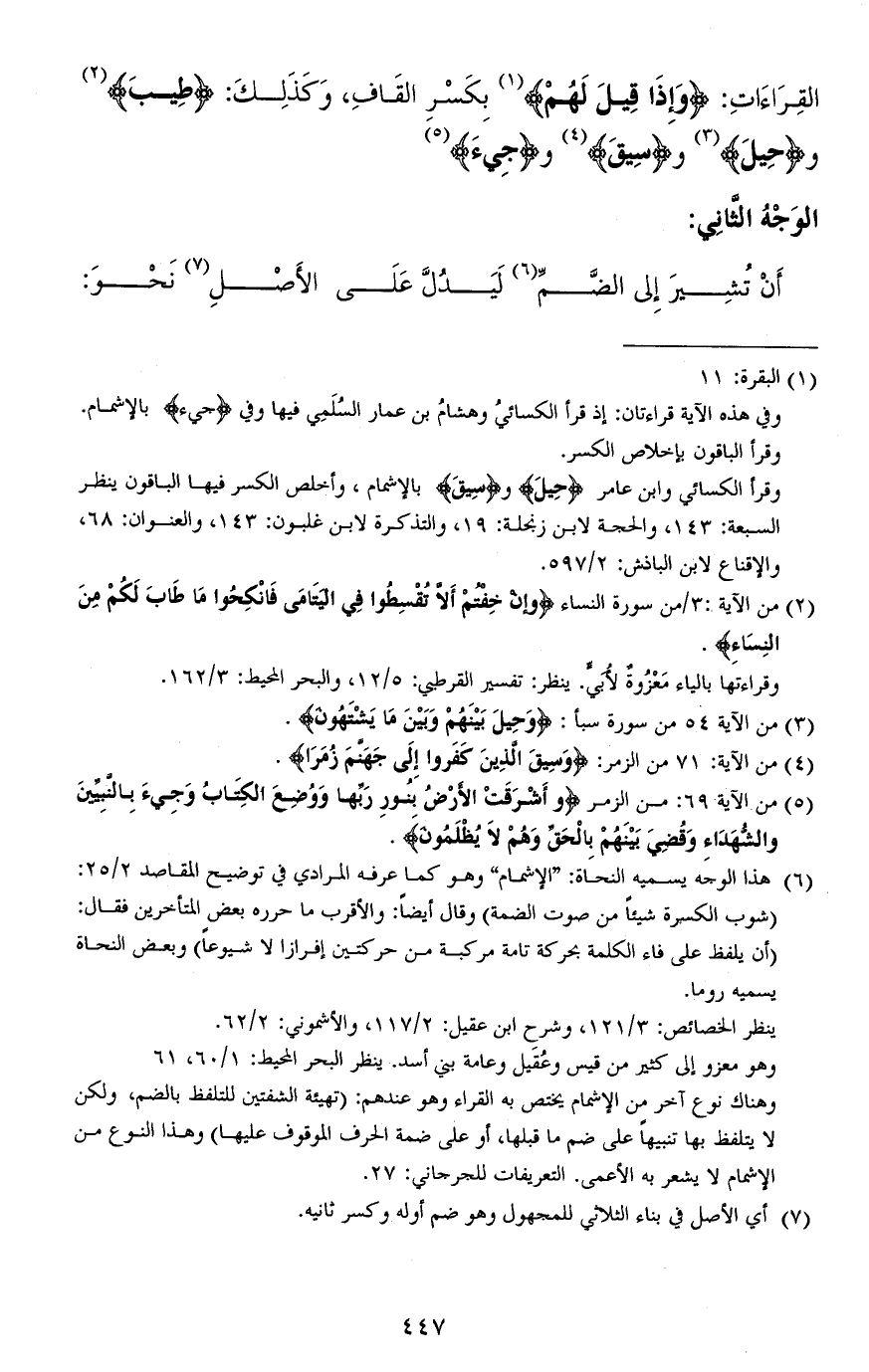 القراءات: (وإذا قِيلَ لهم) [البقرة: 11] بكسر القاف، وكذلك (طِيبَ) [النساء: 3] و (حِيلَ) [سبأ: 54] و (سِيقَ) [الزمر: 71] و (جِيءَ) [الزمر: 69].