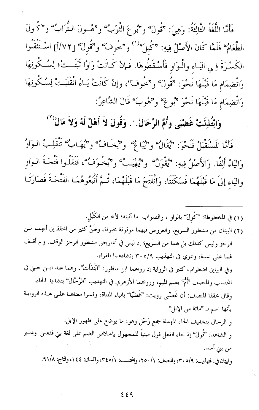 فأمّا اللغة الثالثة: وهي: "قُولَ" و"بُوعَ الثوب" و"هُول التّراب" و"كُولَ الطعامُ" فلمّا كان الأصل فيه: "كُيِلَ" و"خُوِفَ" و"قُوِلَ" استثقلوا الكسرة في الياء والواو فأسقطوها. فإن كانت واوًا ثبتت لسكونها وانضمام ما قبلها نحو: "قُولَ" و"خُوفَ"، وإن كانت ياء انقلبت لسكونها وانضمام ما قبلها نحو "بُوعَ" و"هُوبَ" قال الشاعر: