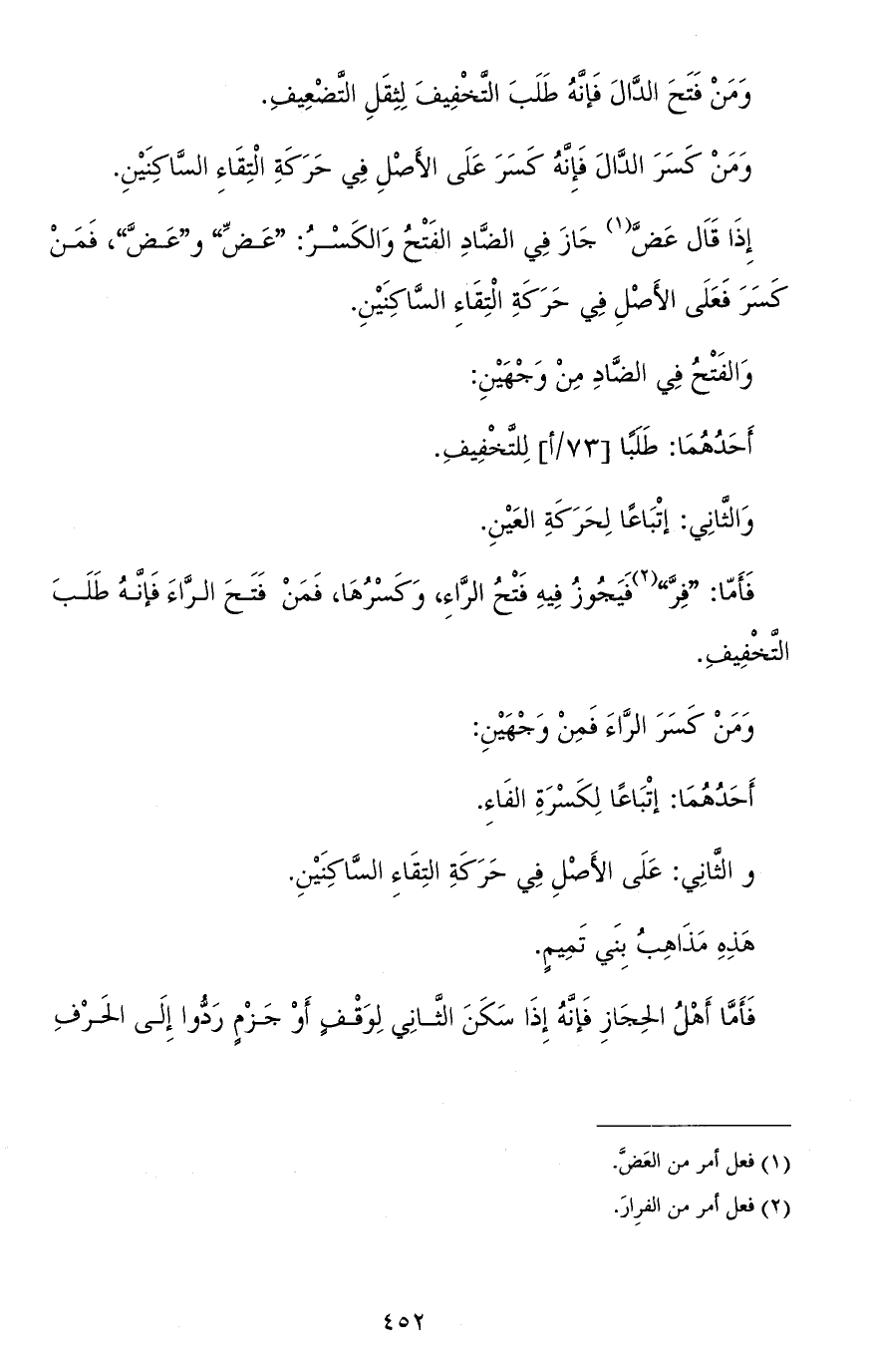فأمّا: "فِرَّ" فيجوز فيه فتح الرّاء، وكسرها، فمن فتح الرّاء فإنّه طلب التّخفيف.