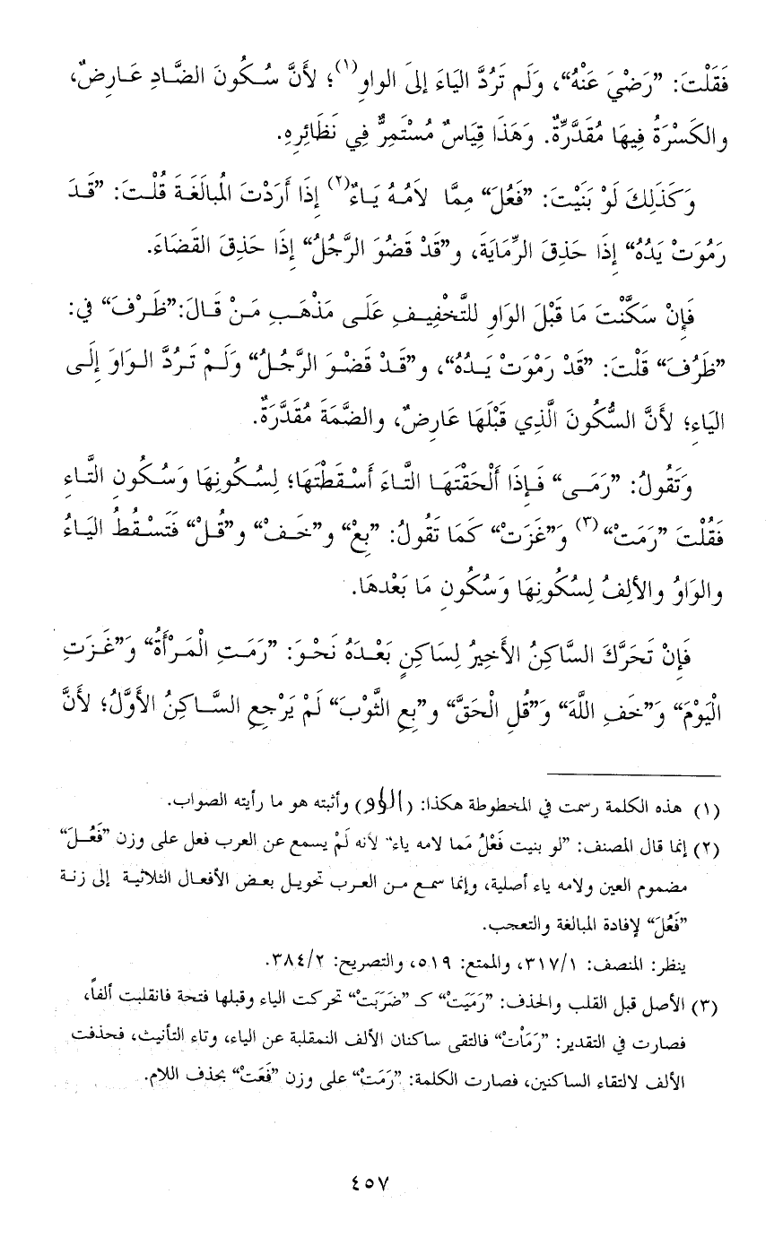 فقلت: "رضْيَ عنه"، ولم تردَّ الياءَ إلى الواو، لأنّ سكون الضّاد عارضٌ، والكسرة فيها مقدّرة. وهذا قياس مستمرٌّ في نظائره.