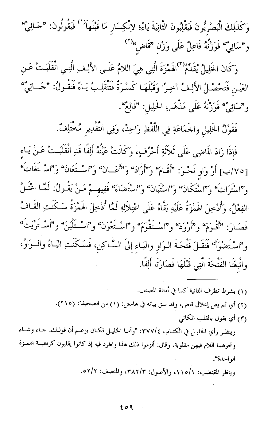 وكان الخليل يقدِّم الهمزة التي هي اللام على الألف التي انقلبت عن العين فتحصل الألف آخرًا وقبلها كسرة فتنقلب ياء فتقول: "جائِيٌ" و"سائِيٌ" فوزنه على مذهب الخليل: "فالِعٌ".