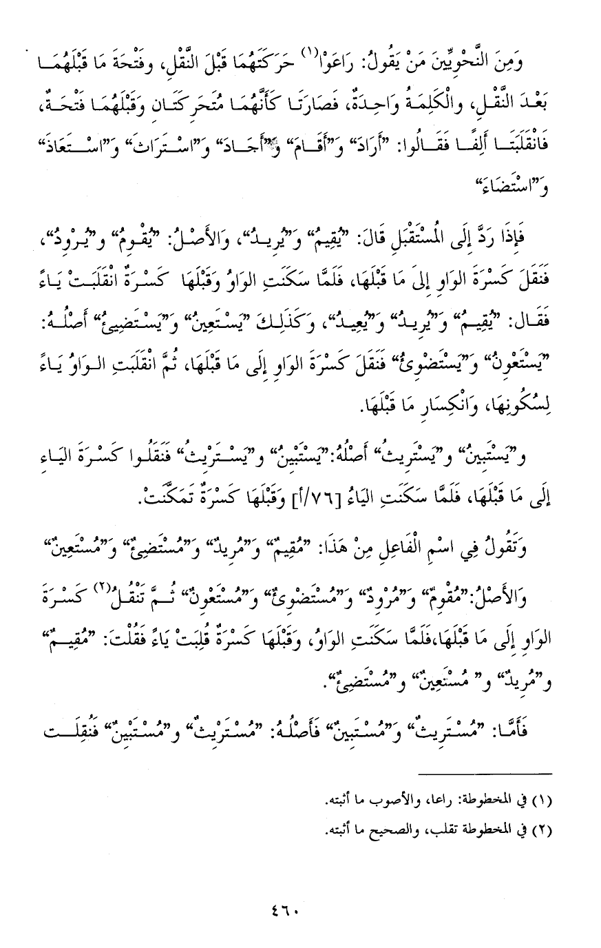 فإذا ردَّ إلى المستقبل قال: "يُقِيمُ" و"يُرِيدُ"، والأصل: "يُقْوِمُ" و"يُرْوِدُ"، فنقل كسرة الواو إلى ما قبلها، فلمّا سكنت الواو وقبلها كسرة انقلبت ياء فقال: "يُقِيمُ" و"يُرِيدُ" و"يُعِيدُ"، وكذلك "يستعينُ" و"يستضيءُ" أصله: "يسْتَعْوِنُ" و"يستضْوِئُ" فقنل كسرة الواو إلى ما قبلها، ثمّ انقلبت الواو ياء لسكونها، وانكسار ما قبلها.