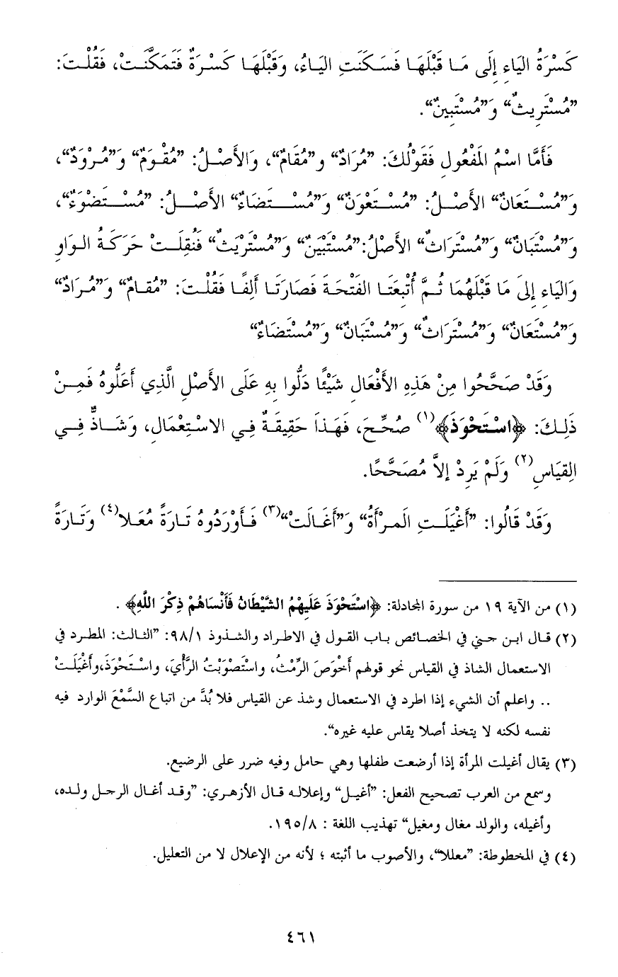 وقد صحّحوا من هذه الأفعال شيئًا دلّوا به على الأصل الذي أعَلُّوه فمن ذلك: (اسْتَحْوَذَ) صحِّح، فهذا حقيقة في الاستعمال، وشاذٌّ في القياس ولم يرد إلا مصحَّحًا.