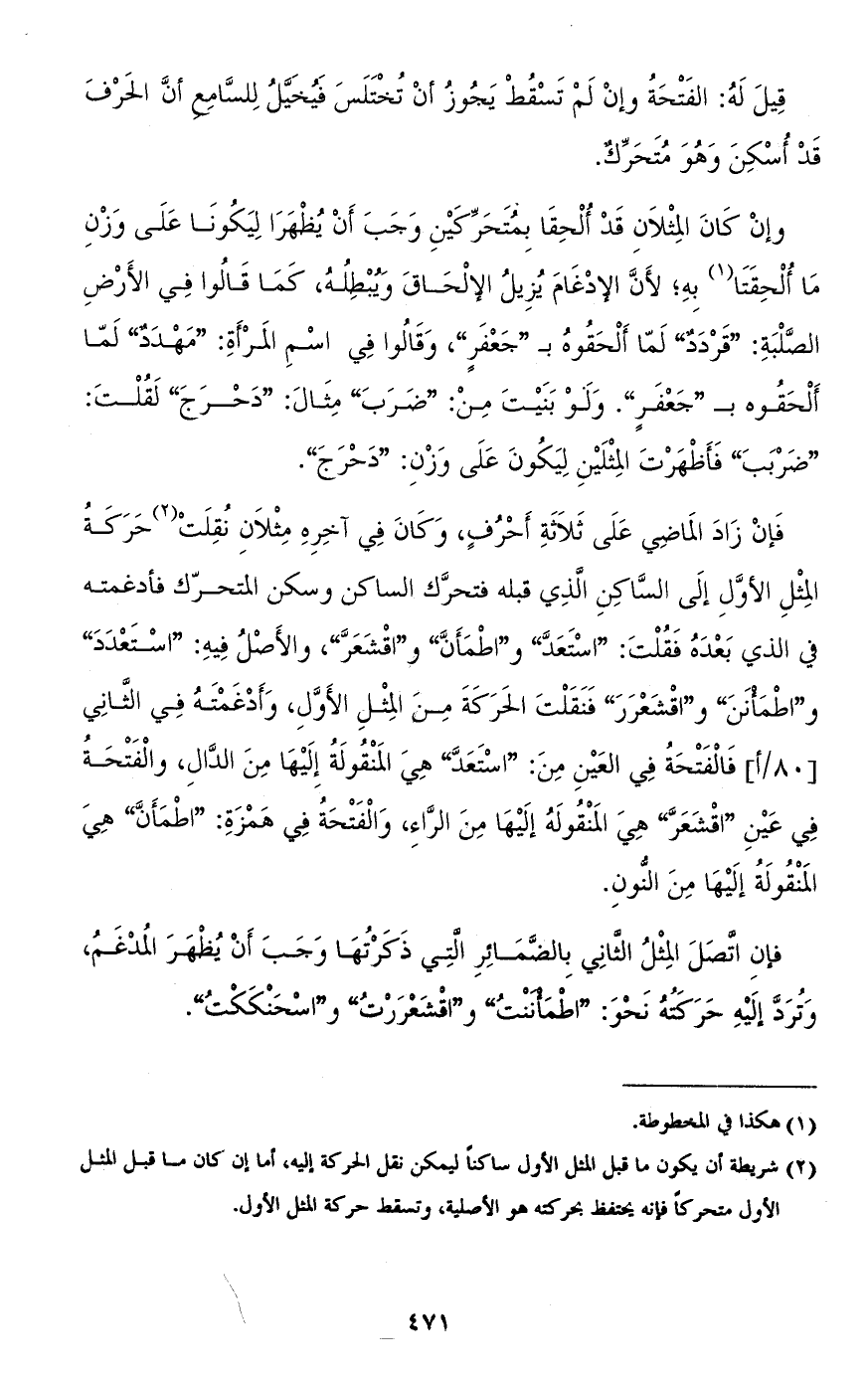 فإن زاد الماضي على ثلاثة أحرف، وكان في آخره مثلان نقلت حركة المثل الأوّل إلى السّاكن الذي قبله فتحرّك الساكن وسكن المتحرك فأدغمته في الذي بعده فقلت: "اسْتَعَدَّ" و"اطْمَأنَّ" و"اقْشَعَرَّ"، والأصل فيه: "اسْتَعْدَدَ" و"اطْمأنَنَ" و"اقْشَعْرَرَ" فنقلت الحركة من المثل الأوّل، وأدغمته في الثاني فالفتحة في العين من: "اسْتَعَدَّ" هي المنقولة إليها من الدّال، والفتحة في عين "اقْشَعَرَّ" هي المنقولة إليها من الرّاء، والفتحة في همزة: "اطْمأنَّ" هي المنقولة إليها من النّون.