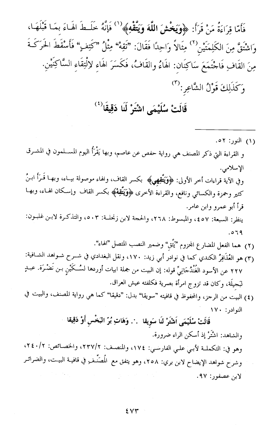 فأمّا قراءة من قرأ: (ويخشَ الله ويتَّقِه) [النور: 52] فإنّه خلط الهاء بما قبلها واشتقّ من الكلمتين مثالاً واحدًا فقال: "تَقِهْ" مثل "كَتِف" فأسقط الحركة من القاف فاجتمع ساكنان: الهاء والقاف، فكسر الهاء لالتقاء السّاكنين.