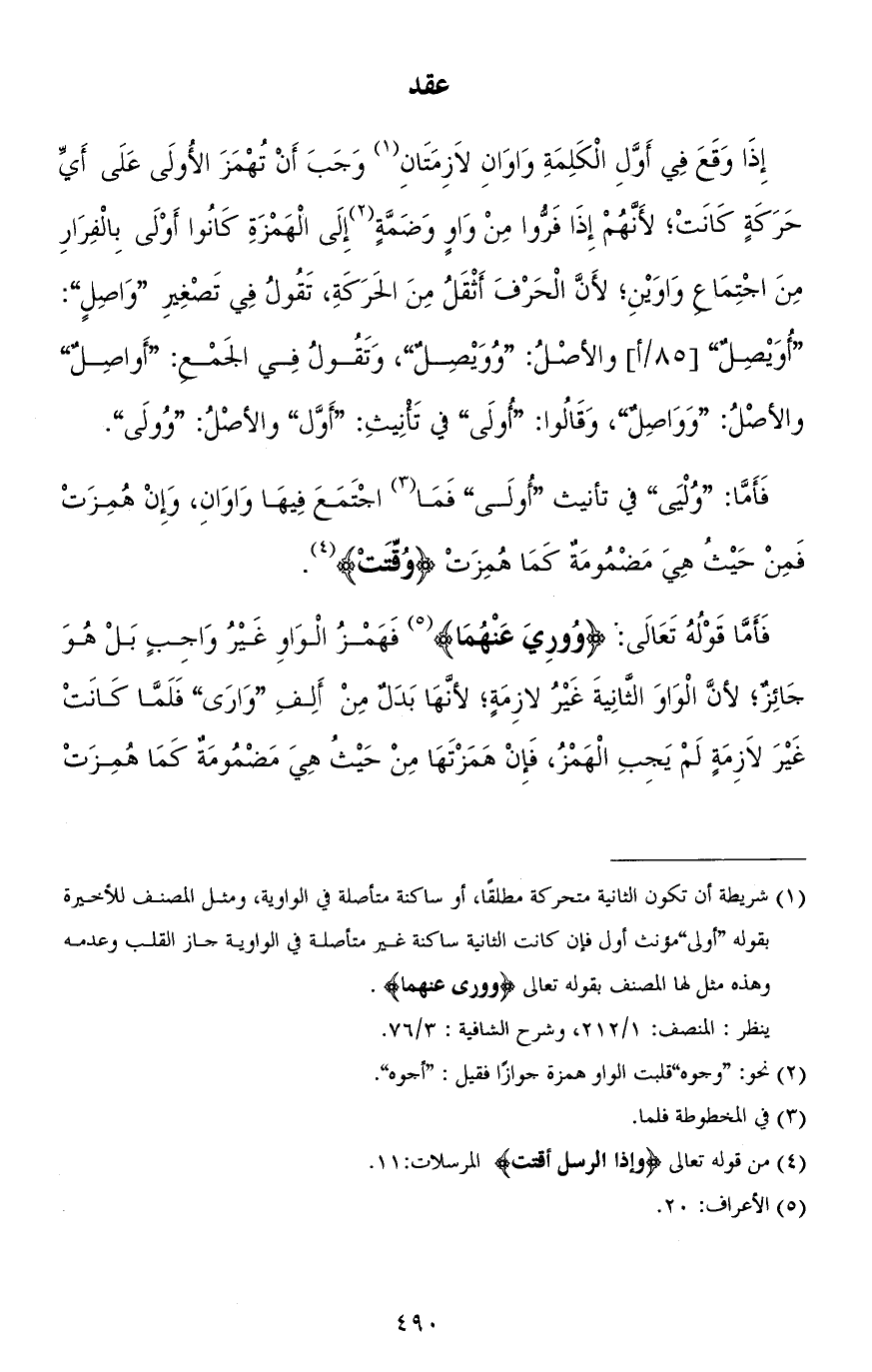 إذا وقع في أوّل الكلمة واوان لازمتان وجب أن تهمز الأولى على أيّ حركة كانت، لأنّهم إذا فرّوا من واو وضمّة إلى الهمزة كانوا أولى بالفرار من اجتماع واوين، لأنّ الحرف أثقل من الحركة، تقول في تصغير "واصِلٍ": "أُوَيْصِلٌ" والأصل: "وُوَيْصِلٌ"، وتقول في الجمع: "أوَاصِلٌ" والأصل: "وَواصِلٌ"، وقالوا: "أُولى" في تأنيث: "أوّل" والأصل: "وُولى".