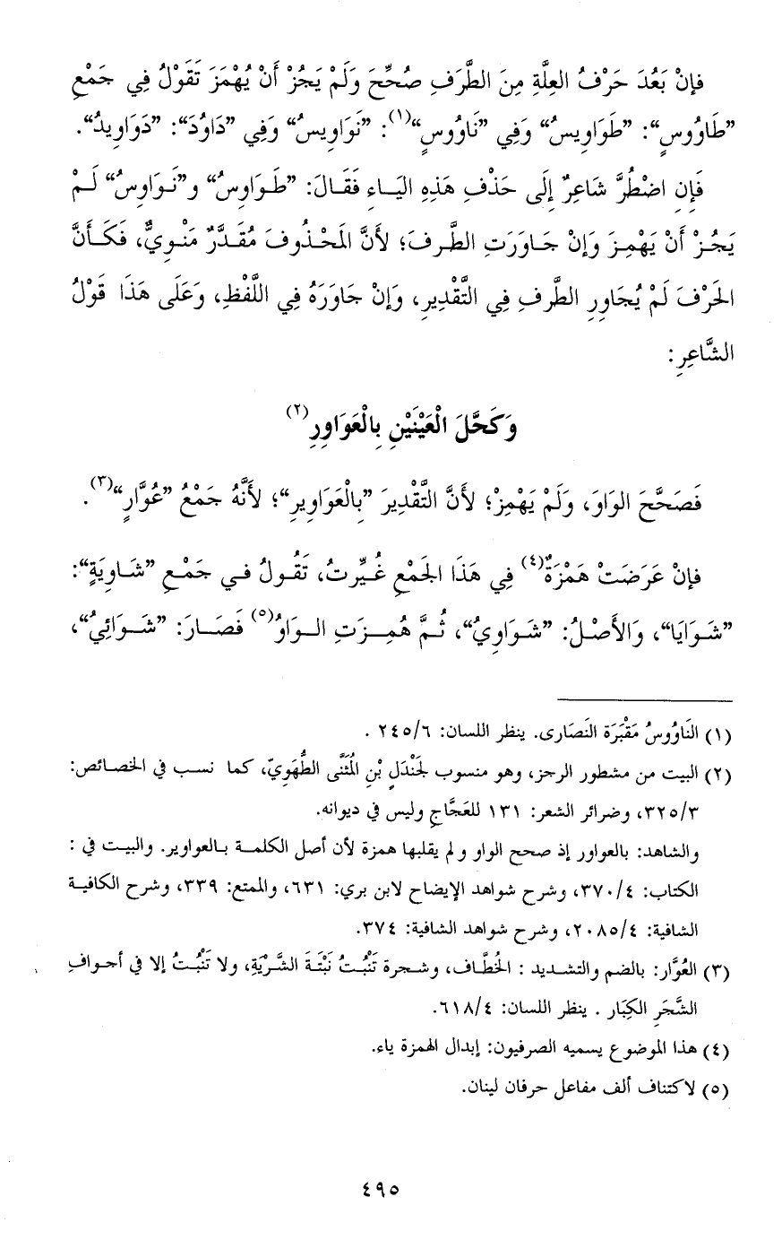 فإن اضطرّ شاعرٌ إلى حذف هذه الياء فقال: "طَواوِسٌ" و"نَواوِسٌ" لم يجز أن يهمز وإن جاورت الطّرف، لأنّ المحذوف مُقَدَّرٌ منويٌّ، فكأنّ الحرف لم يجاور الطّرف في التّقدير، وإن جاوره في اللفظ، وعلى هذا قول الشاعر: