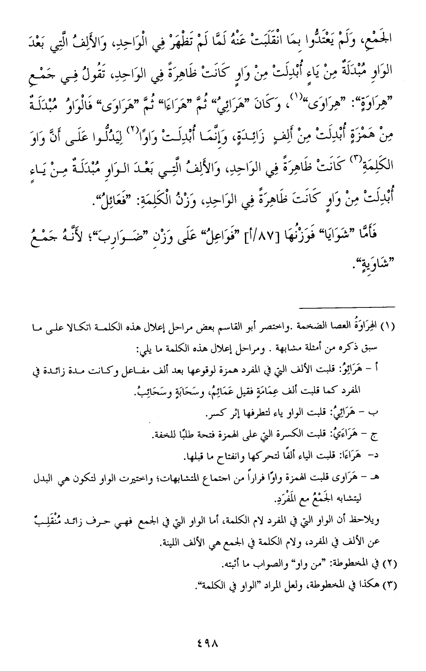 الجمع، ولم يعتدّوا بما انقلبت عنه لمّا لم تظهر في الواحد، والألف التي بعد الواو مبدلة من ياء أبدلت من واو كانت ظاهرة في الواحد، تقول في جمع "هِراوَة": "هِراوَى"، وكان "هَرائِيُ" ثمّ "هَراءا" ثمّ "هَراوى" فالواو مبدلة من همزة أبدلت من ألف زائدة، وإنّما أبدلت واوًا ليدلّوا على أنّ واو الكلمة كانت ظاهرة في الواحد، والألف التي بعد الواو مبدلة من ياء أبدلت من واو كانت ظاهرة في الواحد، وزن الكلمة: "فَعائِلُ".