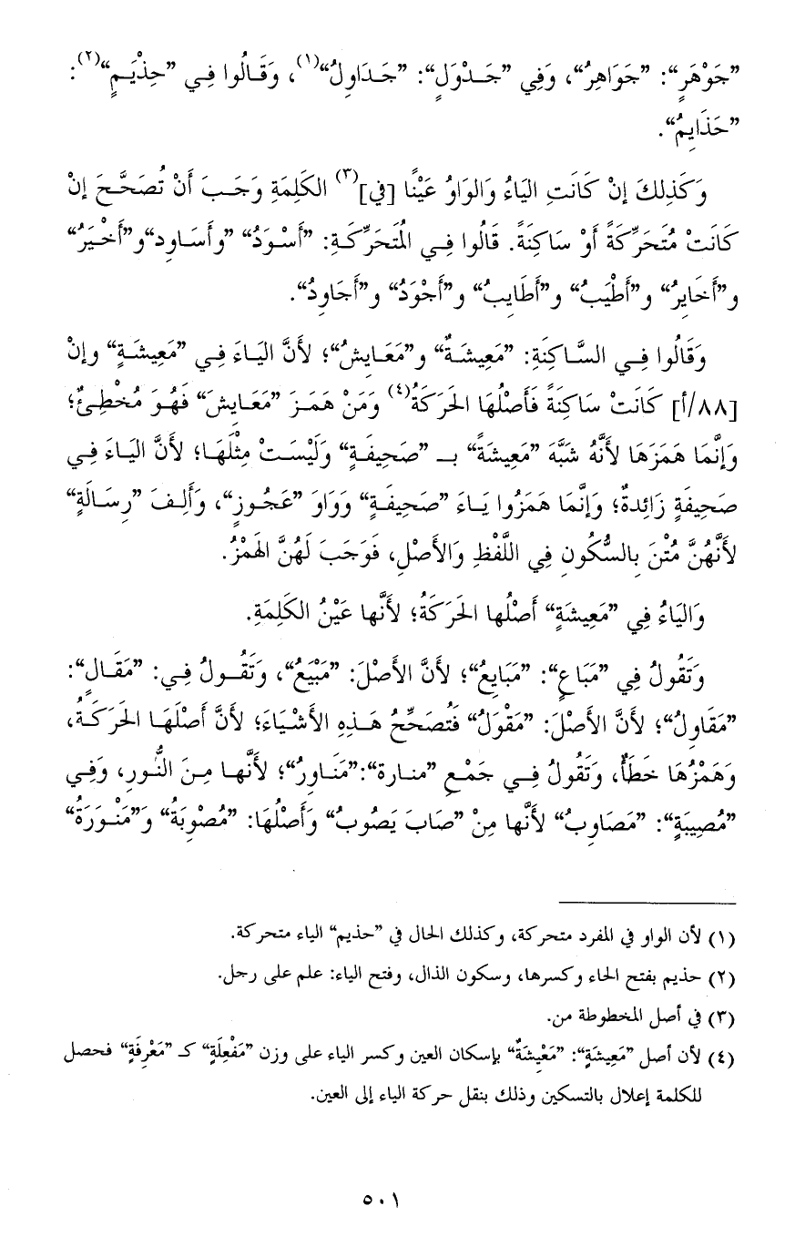 وقالوا في السّاكنة: "مَعيشةٌ" و"مَعايِشُ"، لأنّ الياء في "مَعيشة" وإن كانت ساكنة فأصلها الحركة ومن همزة "مَعايِش" فهو مخطئ؛ وإنّما همزها لأنّه شبّه "معيشة" بـ"صحيفة" وليست مثلها؛ لأنّ الياء في صحيفة زائدة؛ وإنّما همزوا ياء "صحيفة" وواو "عجوز" وألف "رسالة" لأنّهنّ متن بالسّكون في اللفظ والأصل، فوجب لهنّ الهمز.