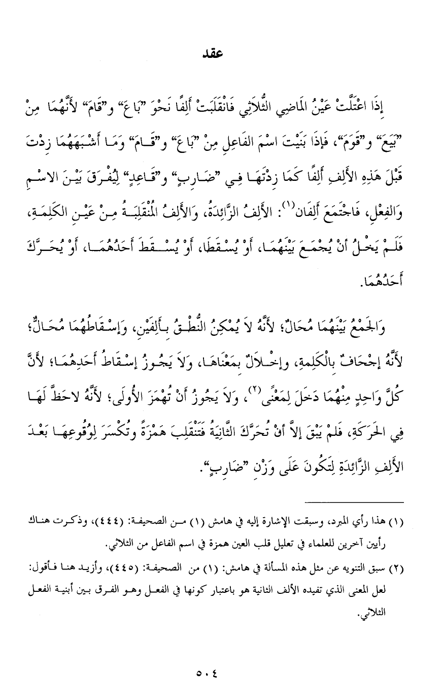 إذا اعتلّت عين الماضي الثلاثي فانقلبت ألفًا نحو "باعَ" و"قام" لأنّهما من "بَيَعَ" و"قَوَمَ"، فإذا بنيت اسم الفاعل من "باعَ" و"قامَ" وما أشبههما زدت قبل هذه الألف ألفًا كما زدتها في "ضارِب" و"قاعِد" ليفرق بين الاسم والفعل، فاجتمع ألفان: الألف الزائدة، والألف المنقلبة من عين الكلمة، فلم يخل أن يجمع بينهما، أو يسقطا، أو يسقط أحدهما، أو يحرّك أحدهما.