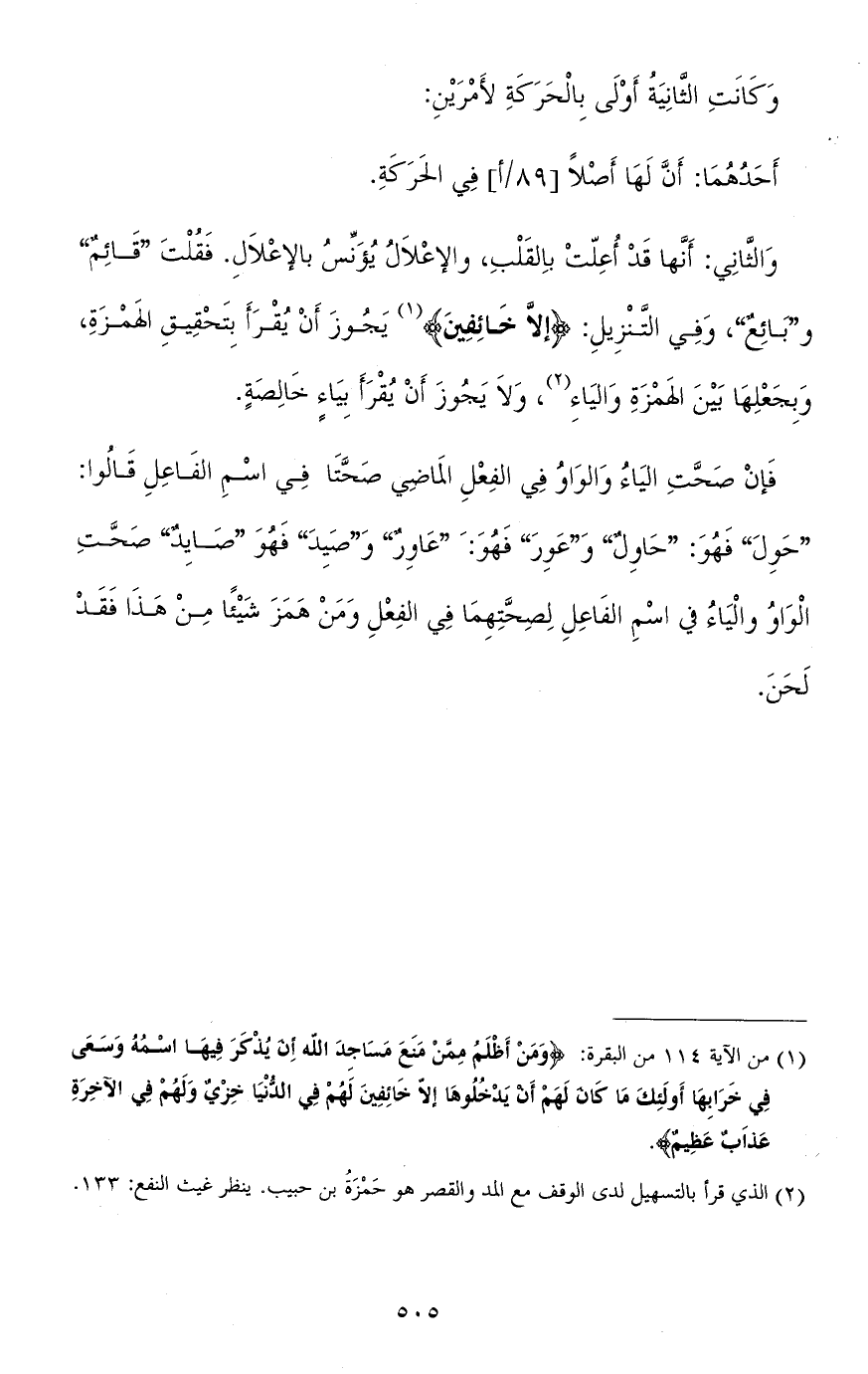 والثاني: أنّها قد أعلّت بالقلب، والإعلال يُؤنِّسُ بالإعلال. فقلت "قائمٌ" و"بائعٌ"، وفي التنزيل (إلا خائفين) يجوز أن يقرأ بتحقيق الهمزة وبجعلها بين الهمزة والياء، ولا يجوز أن يقرأ بياء خالصة.