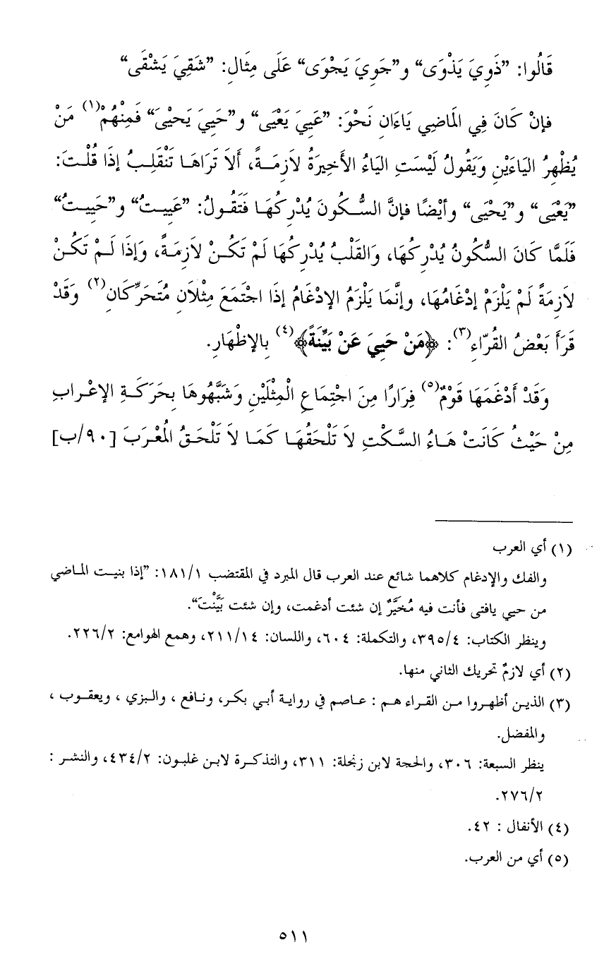 فإن كان في الماضي ياءان نحو: "عَيِيَ يعْيَى" و"حَيِيَ يحْيَى" فمنهم من يظهر الياءين ويقول ليست الياء الأخيرة لازمة، ألا تراها تنقلب إذا قلت: "يَعْيَى" و"يَحْيَى" وأيضًا فإنّ السّكون يدركها فتقول: "عَيِيتُ" و"حَيِيتُ" فلمّا كان السّكون يدركها، والقلب يدركها لم تكن لازمة، وإذا لم تكن لازمة لم يلزم إدغامها، وإنّما يلزم الإدغام إذا اجتمع مثلان متحرّكان وقد قرأ بعض القرّاء: (من حيِيَ عن بيّنة) بالإظهار.