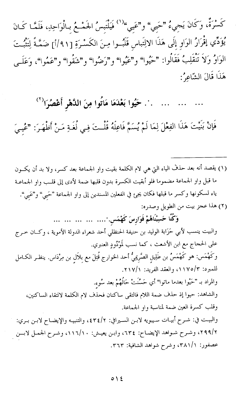 كسرة، وكان يجيءُ "حَيِي" و"عَيِي" فيلتبس الجمع بالواحد، فلمّا كان يؤدّي إقرار الواو إلى هذا الالتباس قلبوا من الكسرة ضمّة لتثبت الواو ولا تنقلب فقالوا: "حَيُوا" و"عَيُوا" و"رَضُوا" و"شَقُوا" و"عَمُوا"، وعلى هذا قال الشاعر: