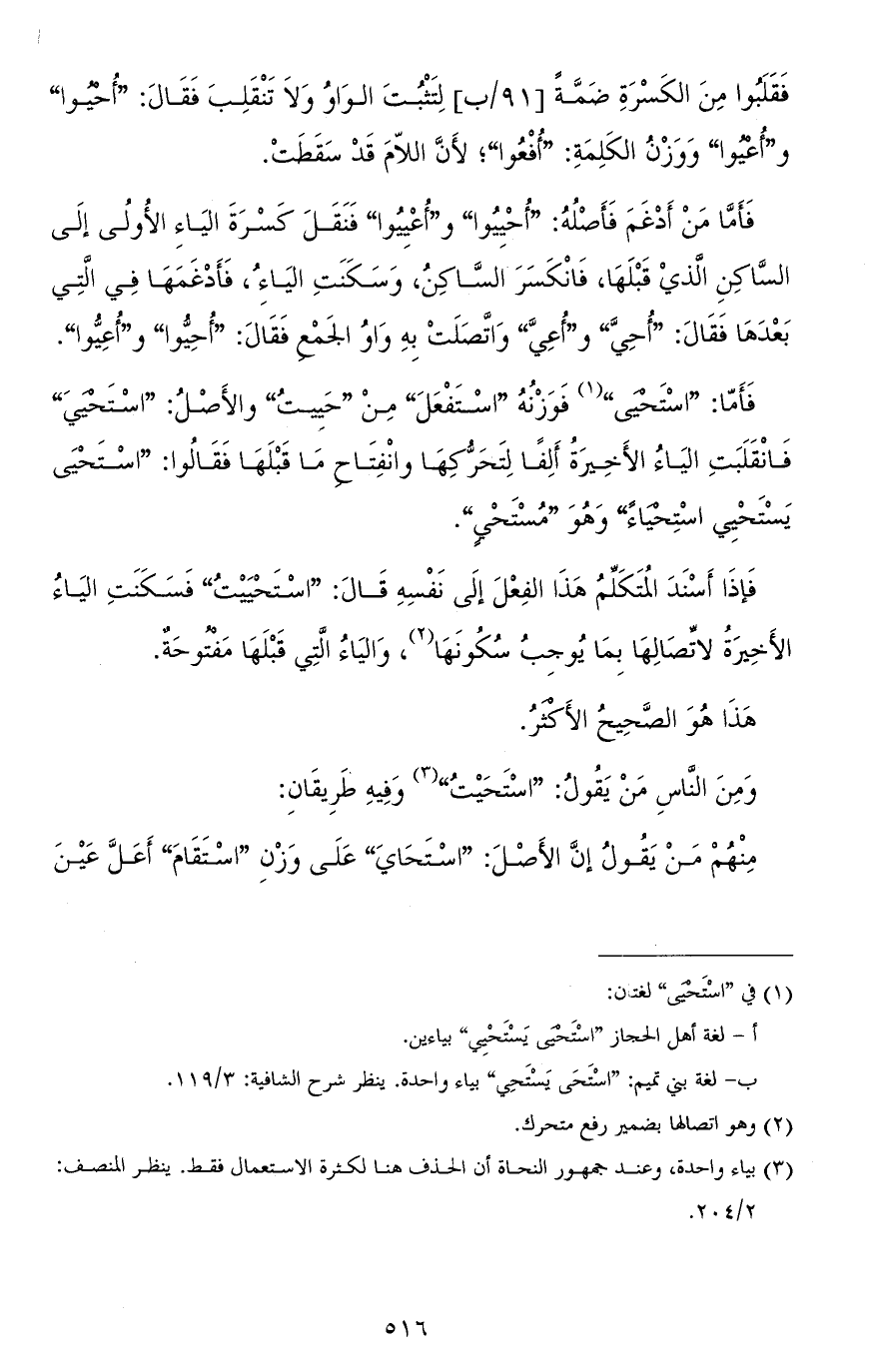 فأمّا: "اسْتَحْيَى" فوزنه "اسْتَفْعَلَ" من "حَيِيتُ" والأصل: "اسْتَحْيَيَ" فانقلبت الياء الأخيرة ألفًا لتحرّكها وانفتاح ما قبلها فقالوا: "اسْتَحْيَى يستحْيِي استحياءً" وهو "مُسْتَحْيٍ".