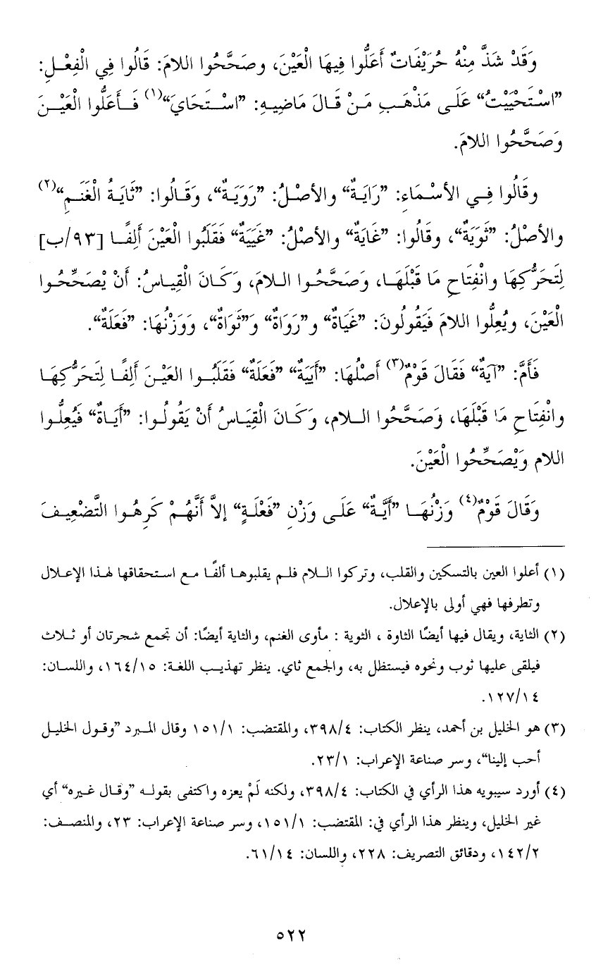 فأمَّ: "آيةٌ" فقال قوم أصلها: "أيَيَةٌ" "فَعَلَةٌ" فقلبوا العين ألفًا لتحرّكها وانفتاح ما قبلها، وصحّحوا اللام، وكان القياس أن يقولوا: "أياةٌ" فيعلّوا اللام ويصحّحوا العين.