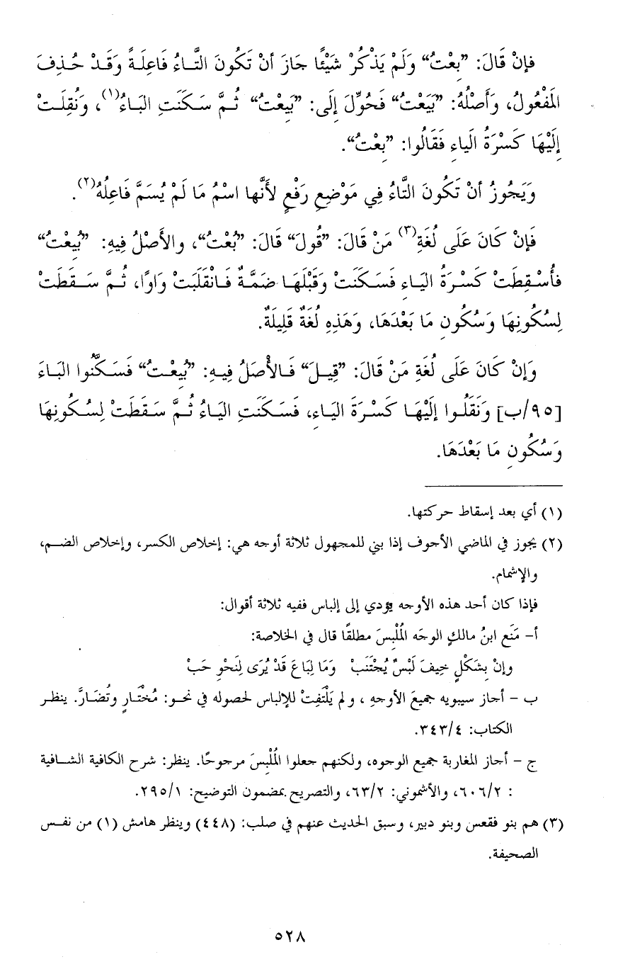 فإن قال: "بِعْتُ" ولم يذكر شيئًا جاز أن تكون التّاء فاعلة وقد حذف المفعول، وأصله: "بَيَعْتُ" فحُوِّل إلى: "بَيِعْتُ" ثمّ سكنت الباء، ونقلت إليها كسرة الياء فقالوا: "بِعْتُ".