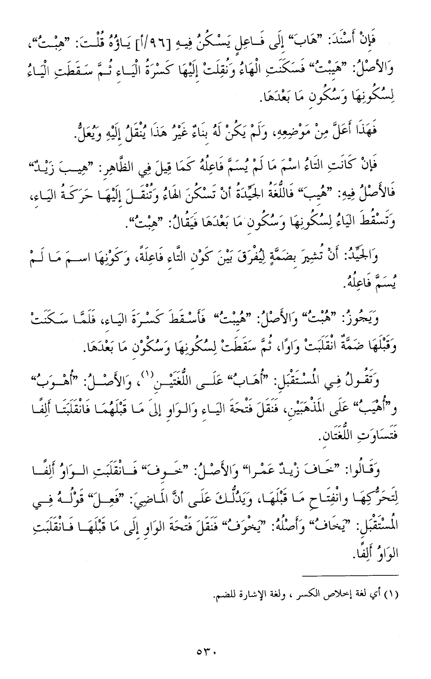 فإن أسند "هابَ" إلى فاعل يسكن فيه ياؤه قلت: "هِبْتُ"، والأصل "هَيِبْتُ" فسكنت الهاء ونقلت إليها كسرة الياء ثمّ سقطت الياء لسكونها وسكون ما بعدها.