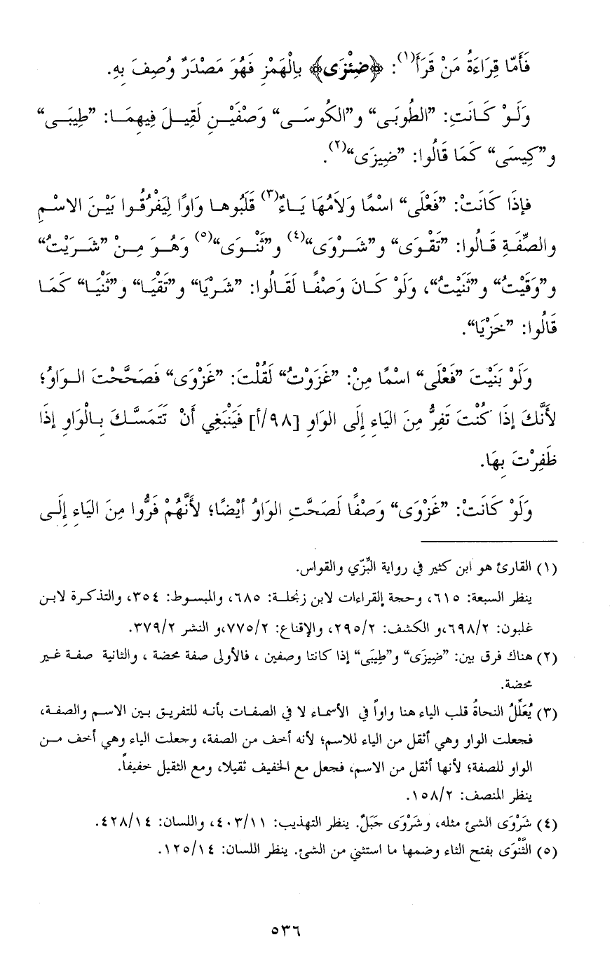 ولو بنيت "فَعْلى" اسمًا من "غَزَوْتُ" لقلت: "غَزْوَى" فصحّحت الواو، لأنّك إذا كنت تفرّ من الياء إلى الواو فينبغي أن تتمسّك بالواو إذا ظفرت بها.