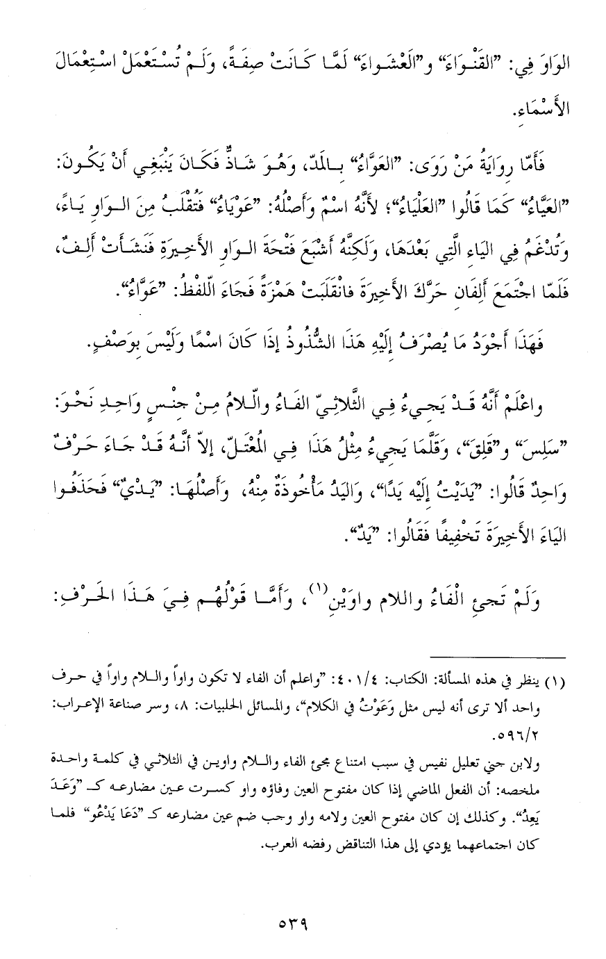 واعلم أنّه قد يجيءُ في الثّلاثيّ الفاء واللام من جنس واحد نحو: "سَلِسَ" و"قَلِقَ"، وقلّما يجيءُ مثل هذا في المعتلّ، إلاّ أنّه قد جاء حرف واحد قالوا: "يدَيْتُ إليه يدًا"، واليد مأخوذة منه، وأصلها: "يَدْيٌ" فحذفوا الياء الأخيرة تخفيفًا فقالوا: "يَدٌ".