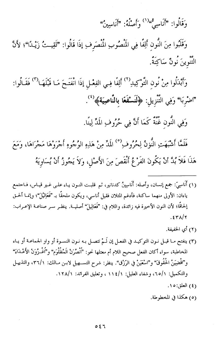 وأبدلوا من نون التّوكيد ألفًا في الفعل إذا انفتح ما قبلها فقالوا: "اضْرِبا" وفي التنزيل: (لنسفعًا بالنّاصية).