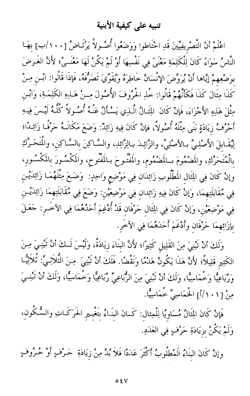 اعلم أنّ التّصريفيين قد احتاطوا ووضعوا أصولا يرتاضُ بها النّاس سواء كان للكلمة معنى في نفسها أو لم يكن لها معنى، لأنّ الغرض بوضعهم إيّاها أن يروِّض الإنسان خاطره ويقوِّيَ تصرُّفَه، فإذا قالوا: ابنِ مِنْ كذا مثالَ كذا فكأنّهم قالوا: خذ الحروف الأصول من هذه الكلمة، وابن مثل هذه الأجزاء، فإن كان المثال الذي يسأل عنه أصولاً كلُّه ليس في أحرف زيادة بنى مثله أصولاً، فإن كان فيه زائد: وضع مكانه حرفًا زائدًا، ليقابل الأصليَّ بالأصليّ، والزّائد بالزّائد، والسّاكن بالسّاكن، والمتحرّك بالمتحرّك، والمضموم بالمضموم، والمفتوح بالمفتوح، والمكسور بالمكسور، وإن كان في المثال المطلوب زائدان في موضع واحد: وضع مثلهما زائدين في مقابلتهما، وإن كان فيه زائدان في موضعين: وضع في مقابلتهما زائدين في موضعين، وإن كان في المثال حرفان قد أدغم أحدهما في الآخر: جعل بإزائهما حرفان وأدغم أحدهما في الآخر.