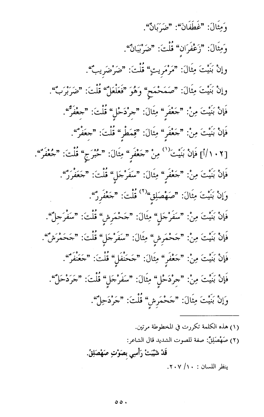 فإن بنيت من "سَفَرْجَل" مثال: "جَحْمَرِش" قلت: "سَفَرْجِلٌ".