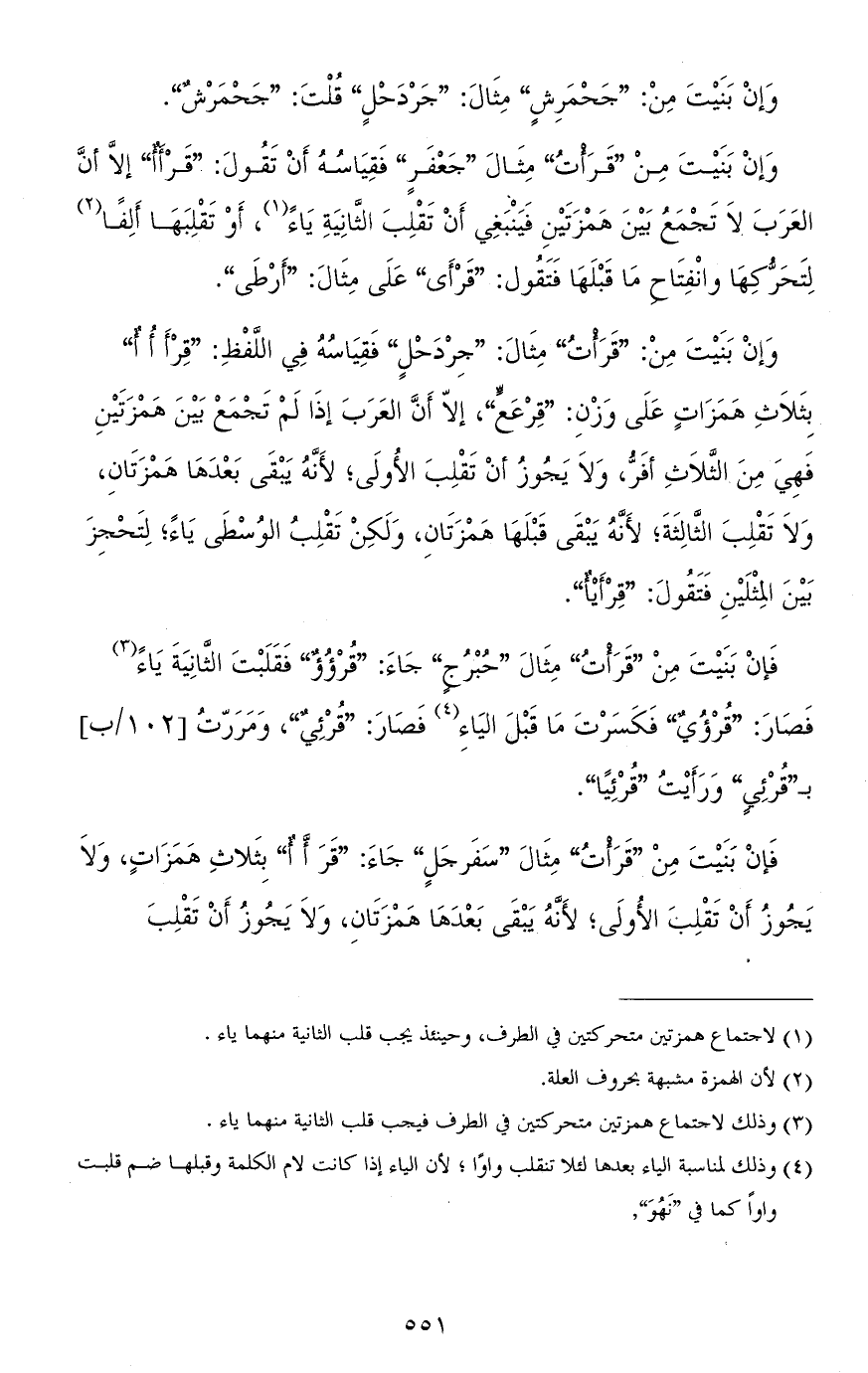 فإن بنيت من "قَراتُ" مثال "سَفَرجَل" جاء: "قَرَأَّ أٌ" بثلاث همزات، ولا يجوز أن تقلب الأولى، لأنّه يبقى بعدها همزتان، ولا يجوز أن تقلب