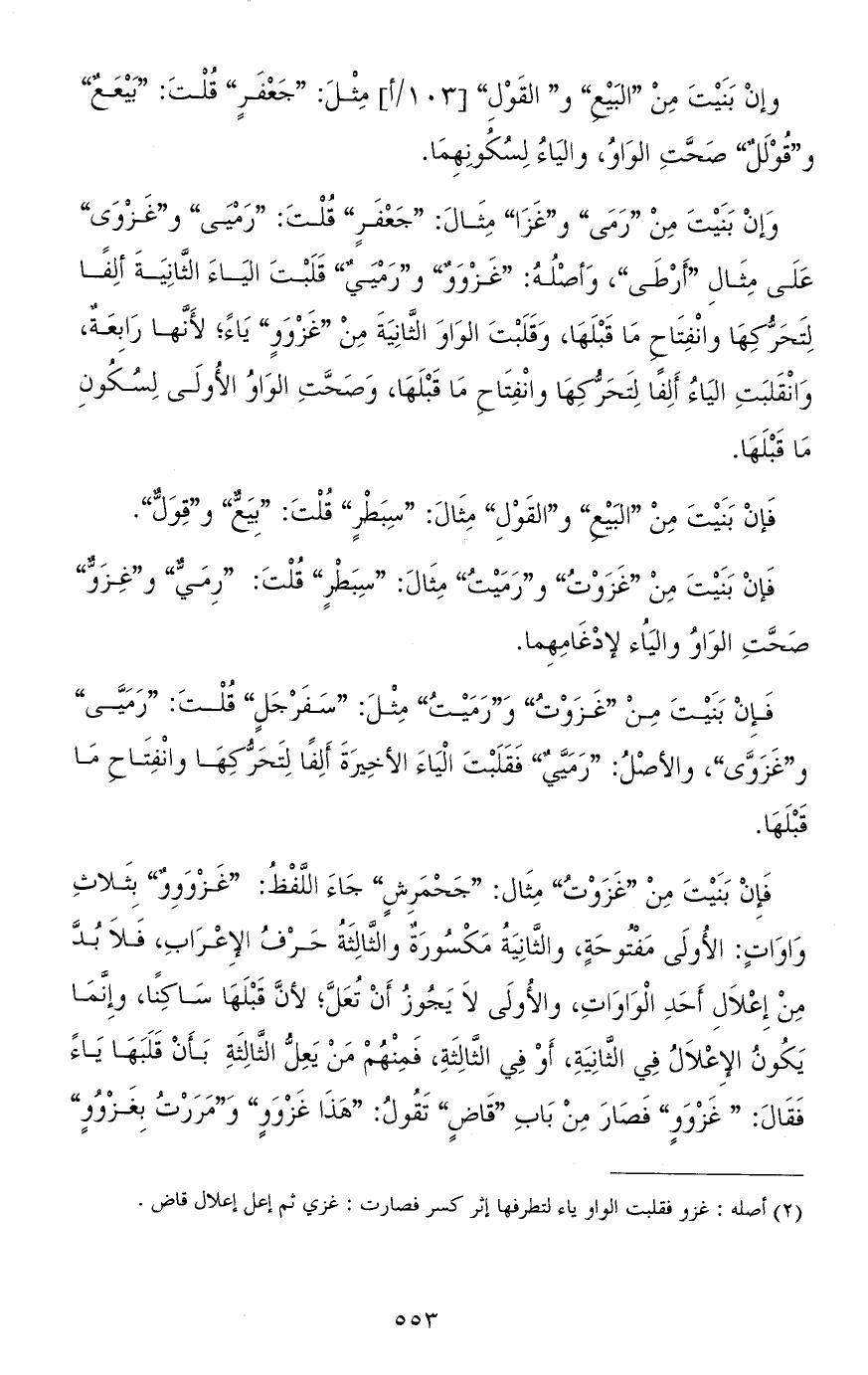 فإن بنيت من "غَزَوْتُ" مثال: "جَحْمَرِش" جاء اللفظ: "غَزْوَوِوٌ" بثلاث واواتٍ: الأولى مفتوحة، والثانية مكسورة والثالثة حرف الإعراب، فلا بدّ من إعلال أحد الواوات، والأولى لا يجوز أن تعلَّ، لأنّ قبلها ساكنًا، وإنّما يكون الإعلال في الثانية، أو في الثالثة، فمنهم من يعلّ الثالثة بأن قلبها ياء فقال: "غَزْوَوٍ" فصار من باب "قاضٍ" تقول: "هذا غَزْوَوٍ" و"مررت بغَزْوُوٍ".