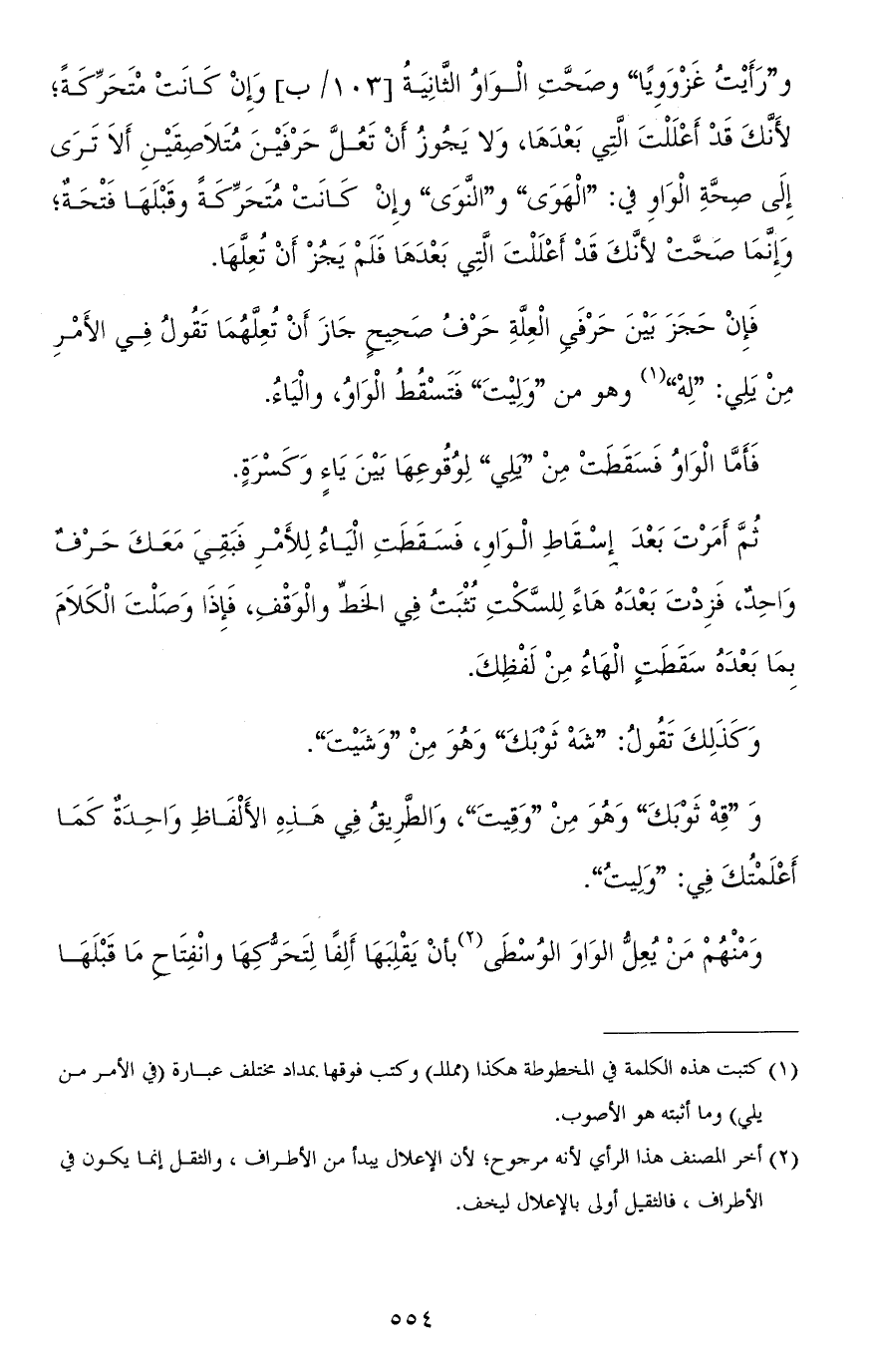و"رأيتُ غَزْوَوِيًا" وصحّت الواو الثانية وإن كانت متحرّكة، لأنّك قد أعللت التي بعدها، ولا يجوز أن تعلَّ حرفين متلاصقين ألا ترى إلى صحّة الواو في: "الهَوَى" و"النَّوى" وإن كانت متحرّكة وقبلها فتحة، وإنّما صحّت لأنّك قد أعللت التي بعدها فلم يجز أن تعلّها.